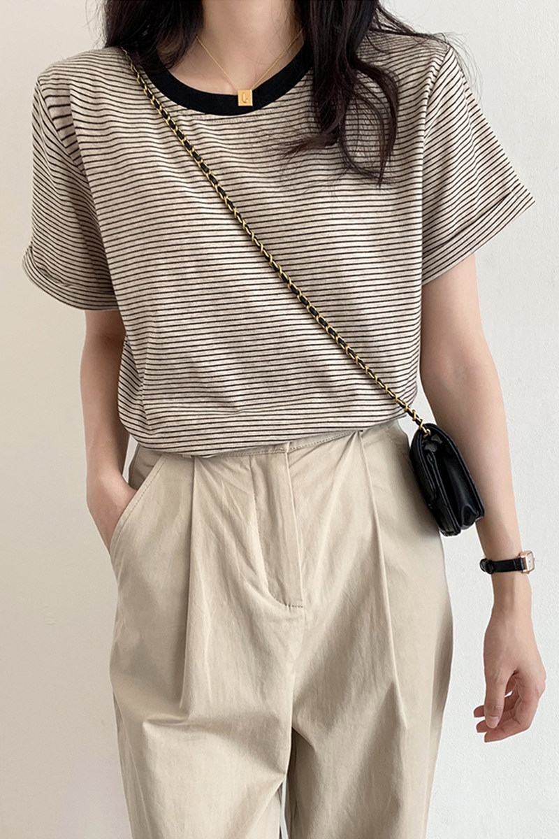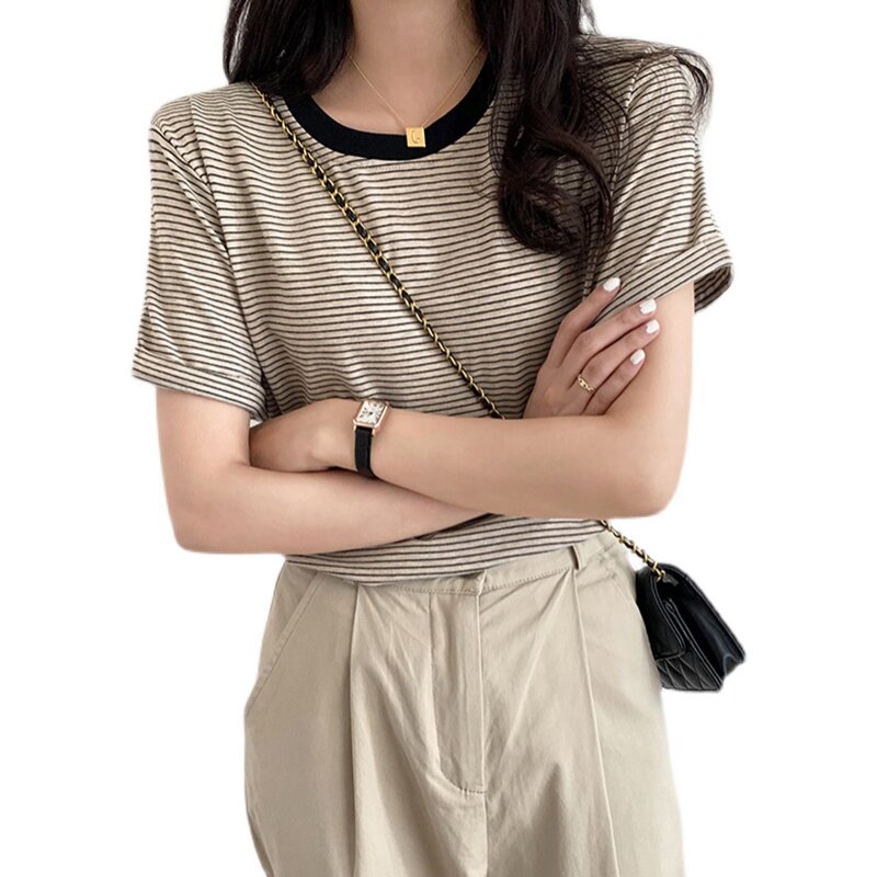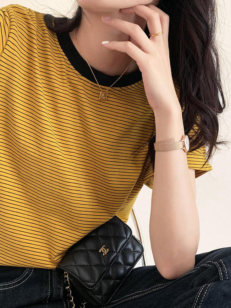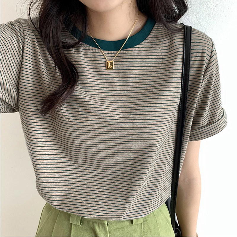 Summer new round collar small sub short sleeve striped T-shirt female loose design feeling small crowd short and don't make blouses