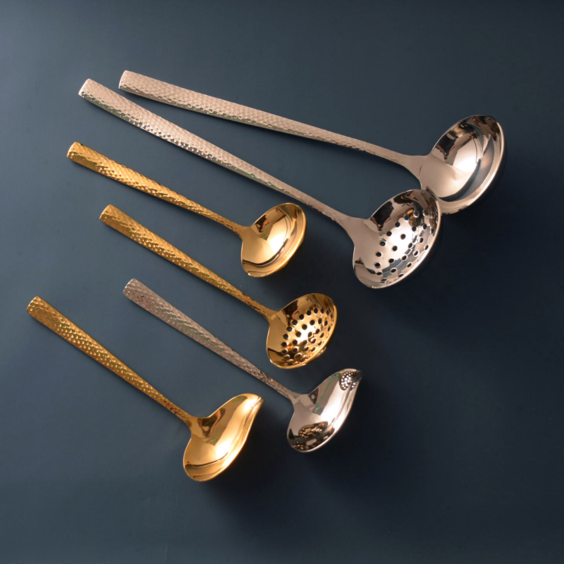 Silver oil spoon, gold oil spoon, silver small spoon, silver small colander, gold small spoon, golden small spoon, silver large spoon, silver large colander, golden large spoon, golden large colander