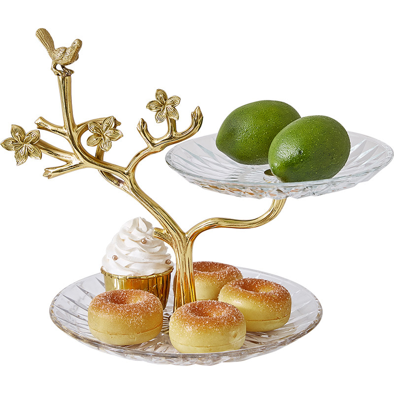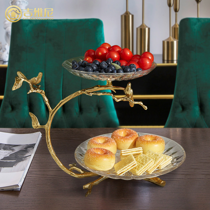 High-end brass tray double layer of fruit disc fittings light luxury dining table new Chinese plate living room glass