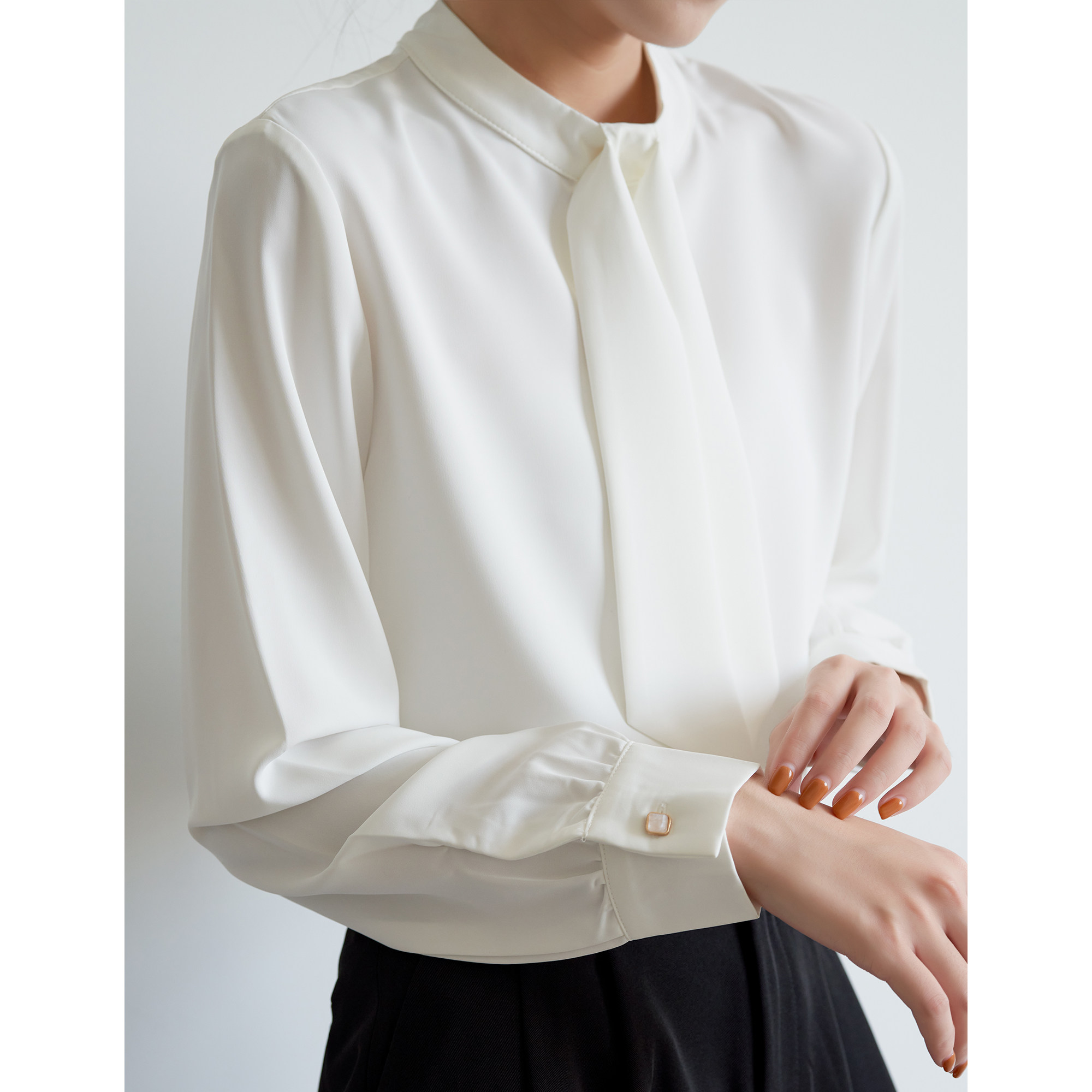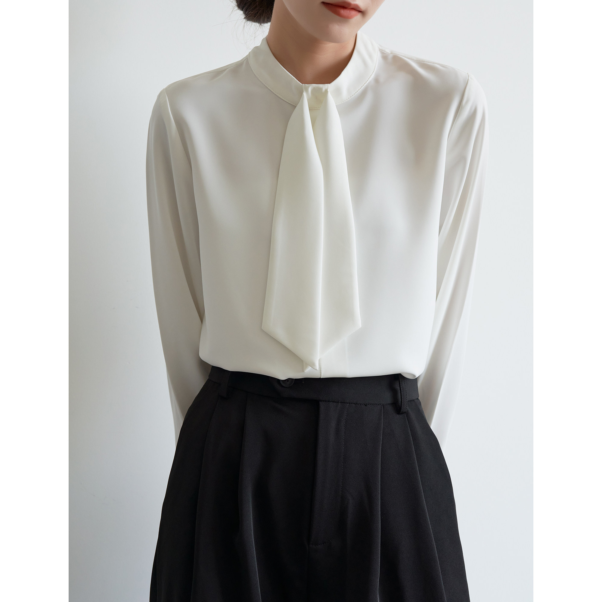 S AUTUMN white streamer satin shirt female Hong Kong style retro drape careful machine commuter round neck shirt spring