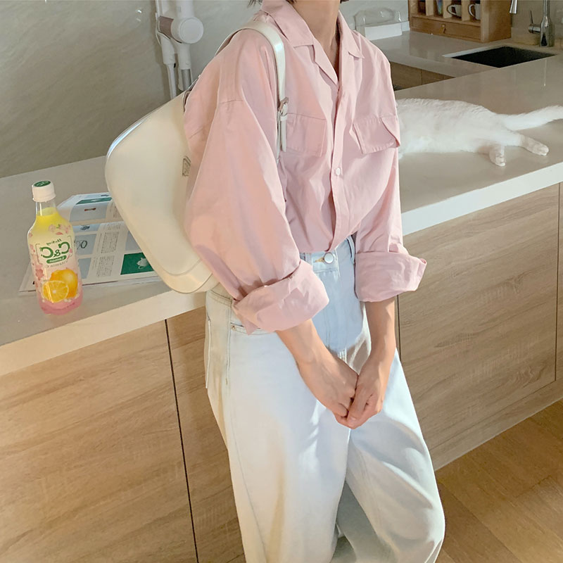 freshtaro Klein blue light pink purple combed cotton V collar special pocket loose shirt woman autumn long sleeves