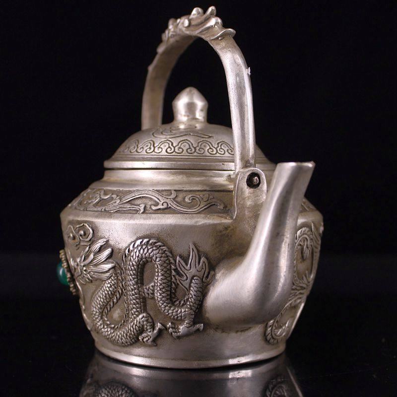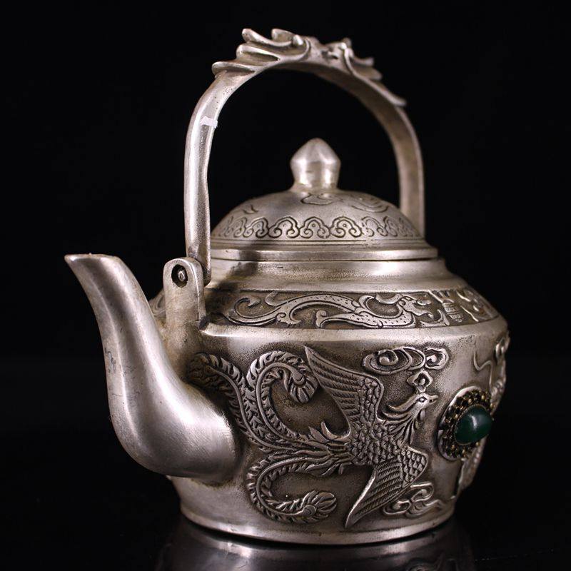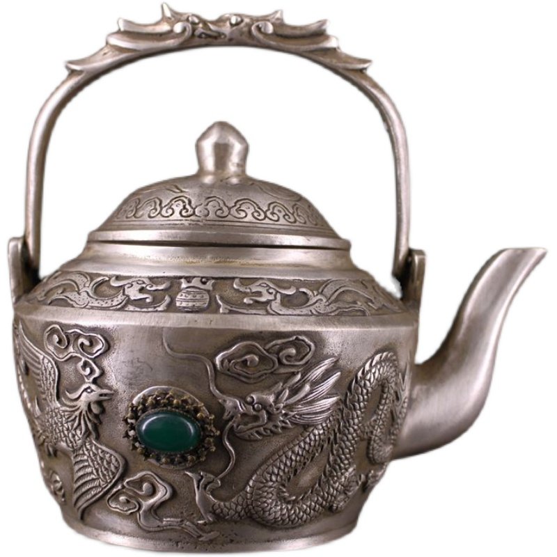Antique pure copper personality creative inlaid gem white copper dragon phoenix teapot kettle hip flask home tea table desk ornaments