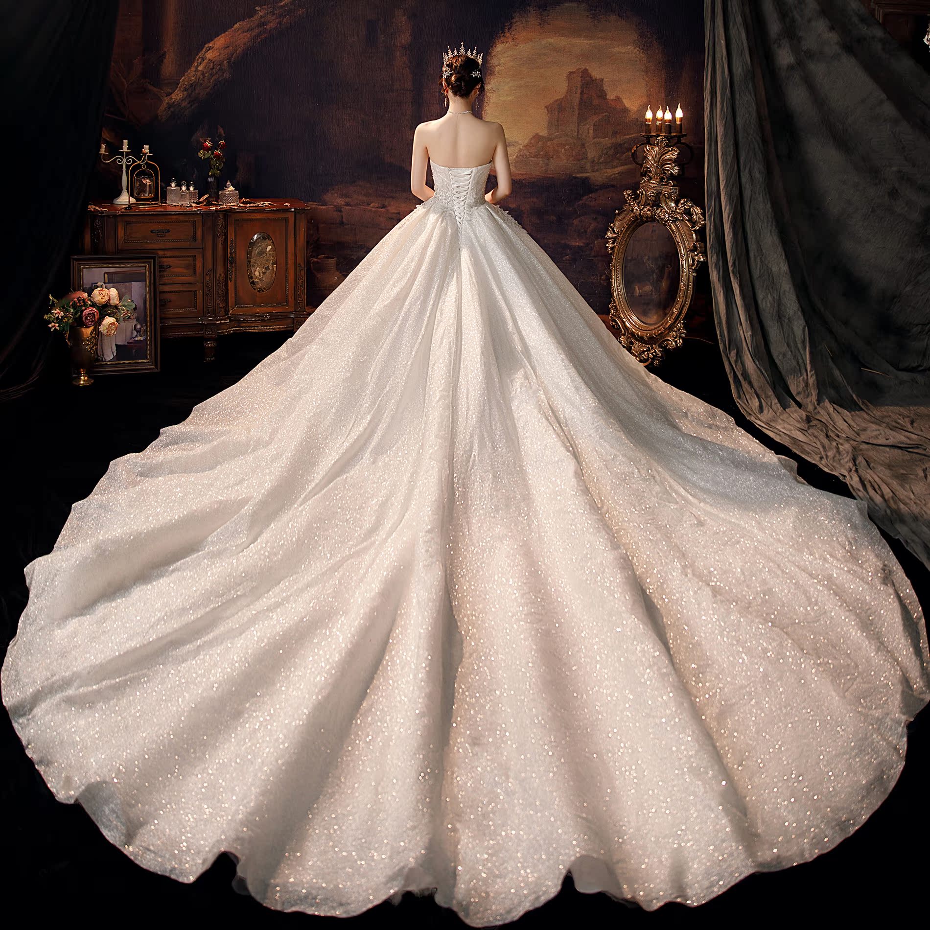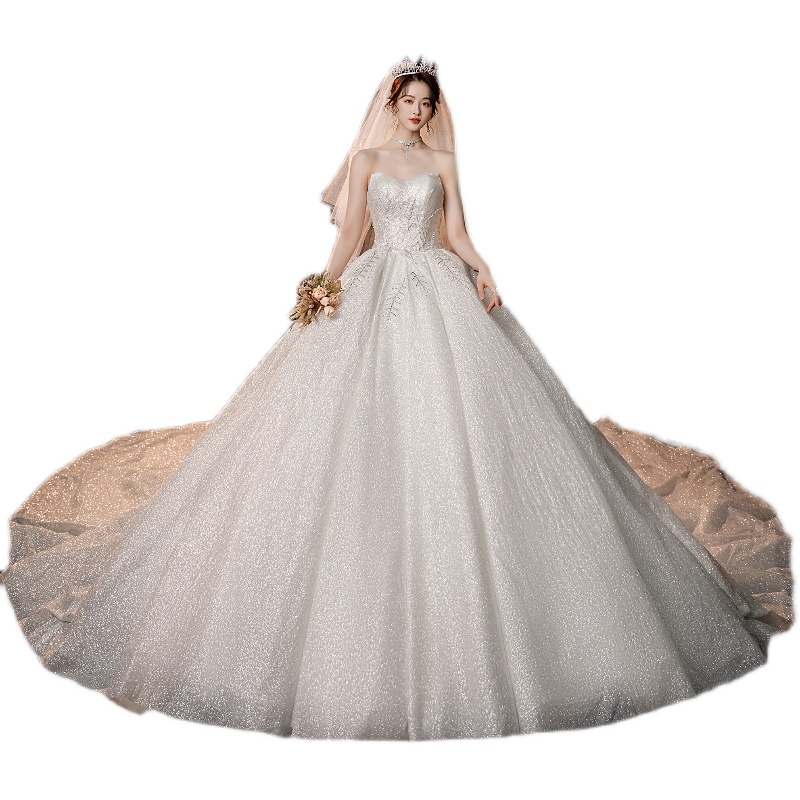 Straight Shoulder Wedding Dress Gown 2021 New Bridal style Breast Luxury Spray Gold Lace Big Trailing