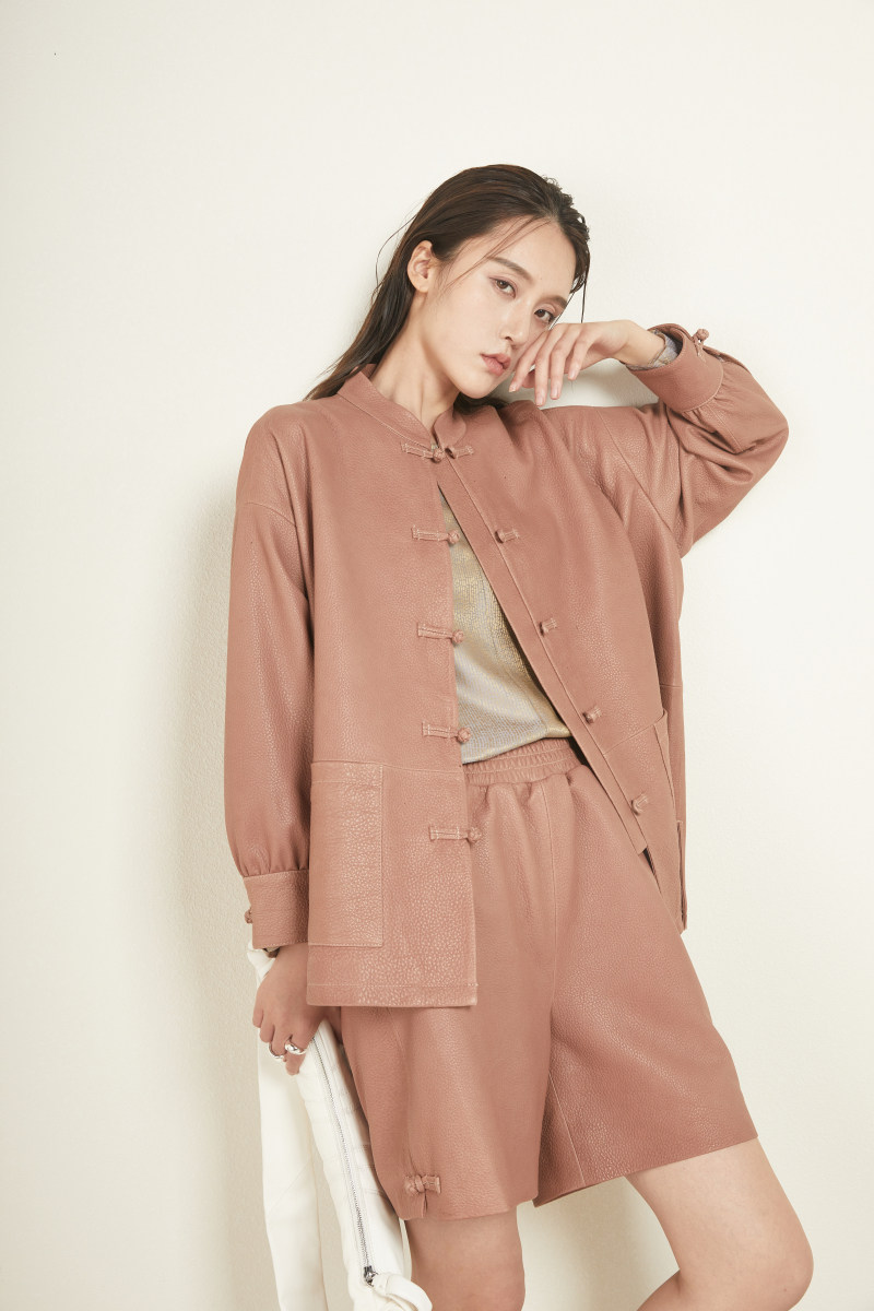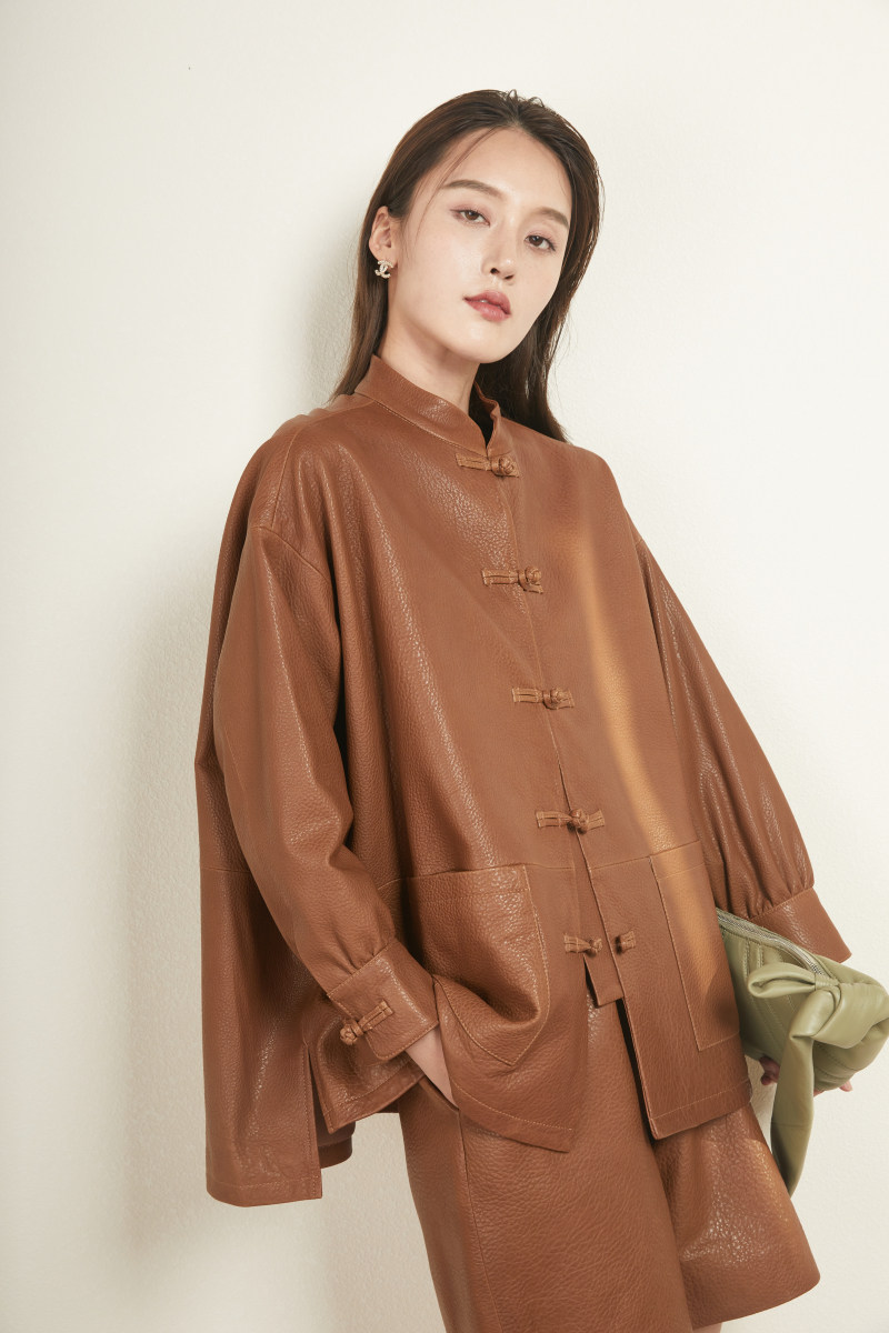 National Rhymes Extravaganza full handmade disc buckle lychee print Imported Leather leather Loose Outline Chinese Leather Coat Jacket Woman