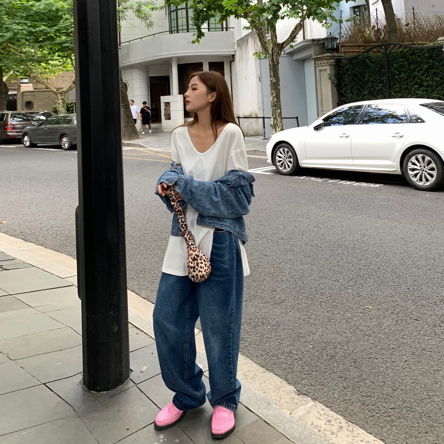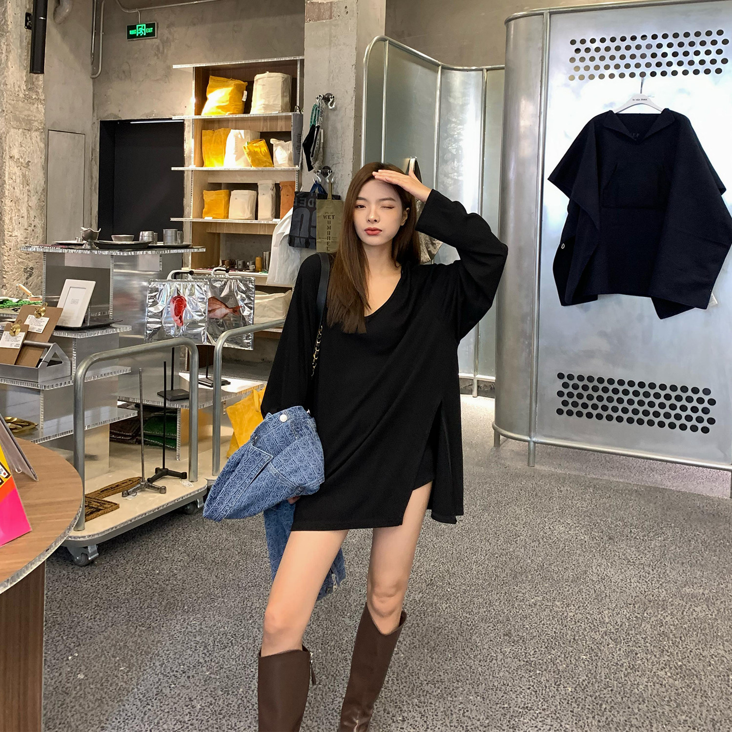 Chen Mifan white V-neck slit T-shirt women's autumn 2022 new design loose solid color knitted top