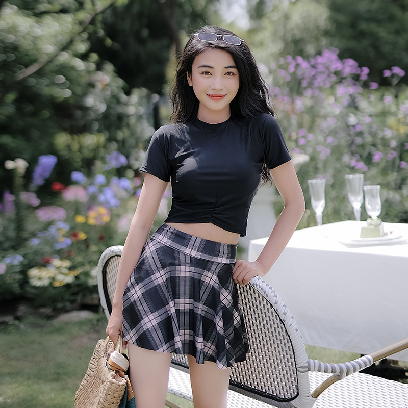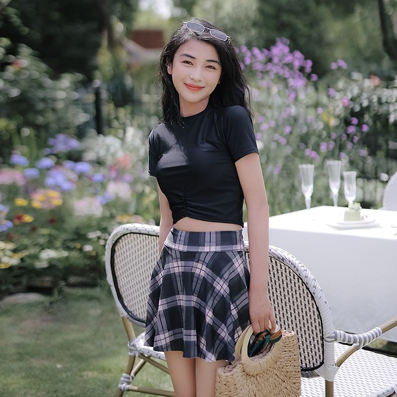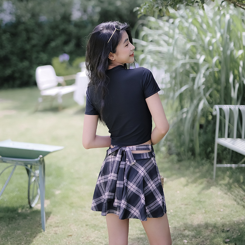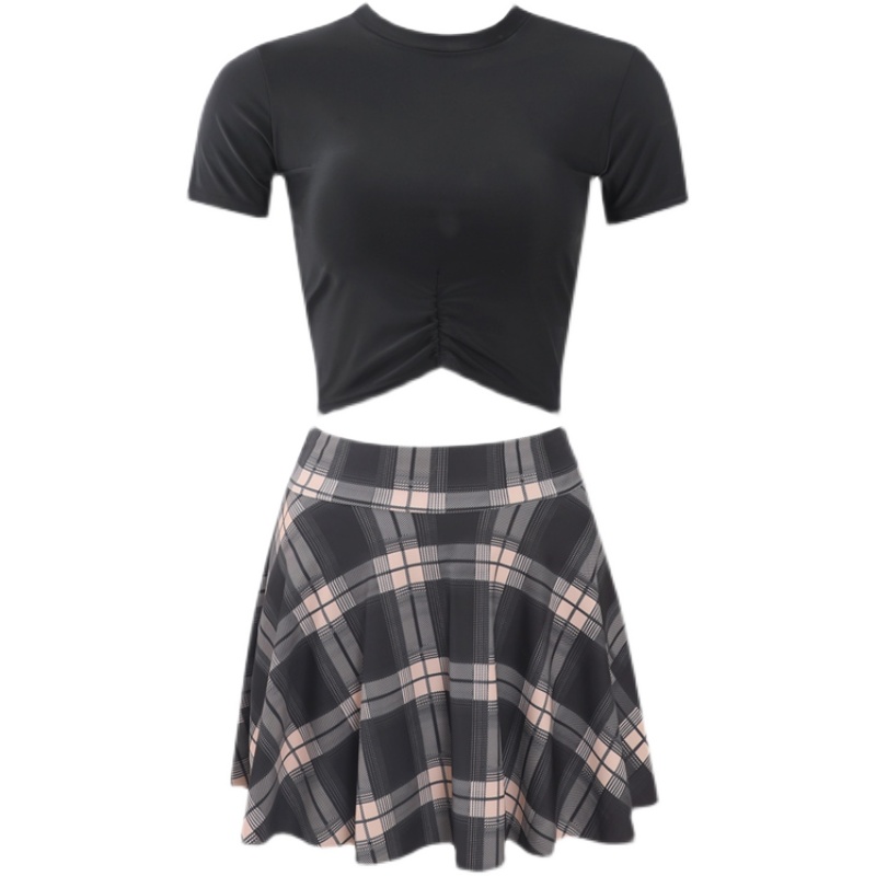 Mimoi 2022 New Short Sleeves Black Day Ensemble Cute Two-style Student Skirt JK Plaid Swimsuit Women Summer