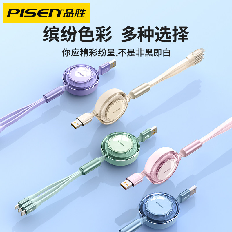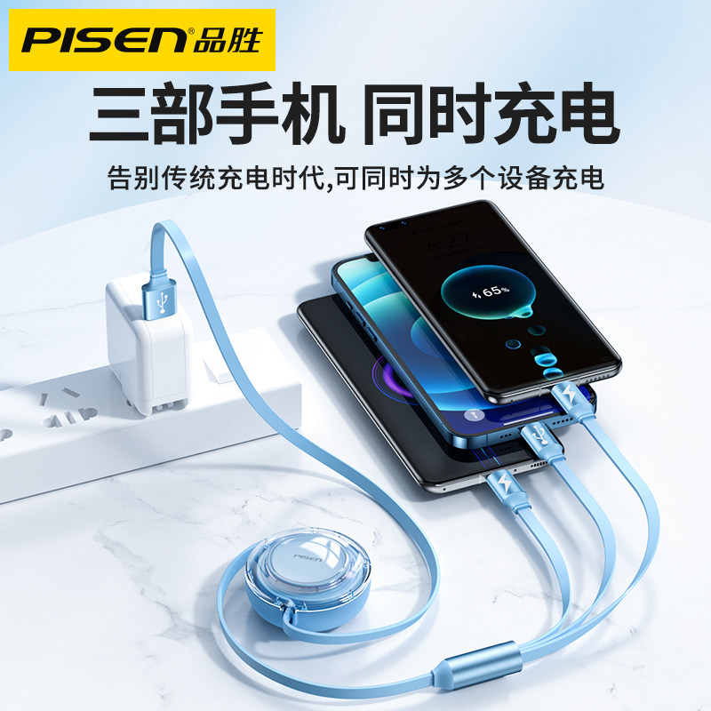 Pinsheng three-in-one data line telescopic charging cable one drag three fast charging three heads suitable for Apple Huawei Android Typec mobile phone tablet 66W flash charge car charger line multi-function universal line