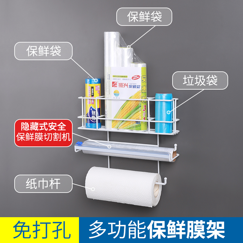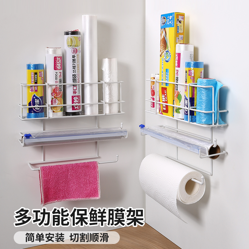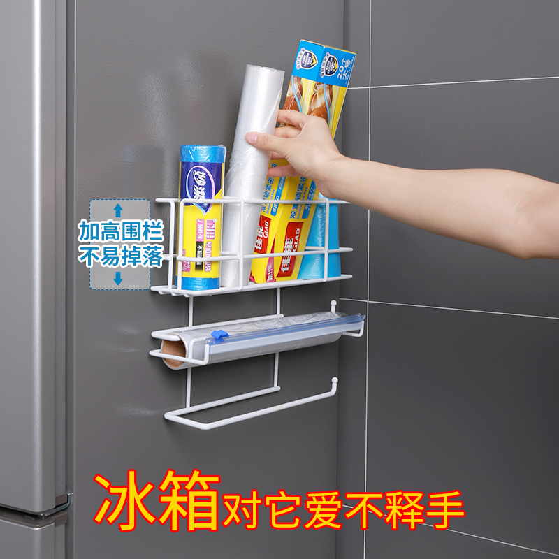 Refrigerator shelve side containing side wall-mounted kitchen paper towel rack free of punch adjustable preservation film cutter