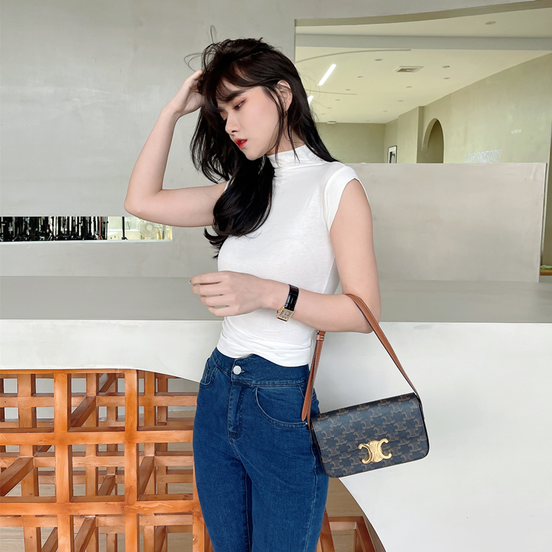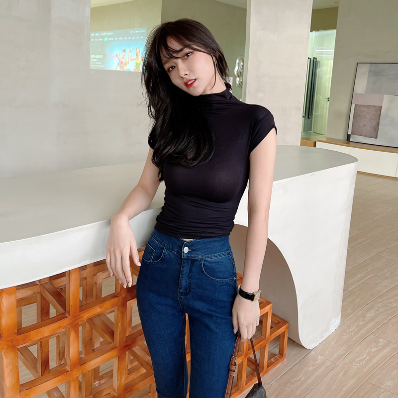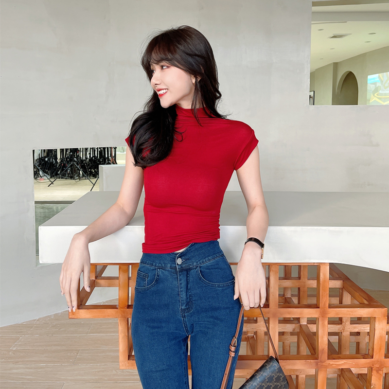 Kaka women's official flagship Korean version half-high collar slim boat sleeve T-shirt women's summer retro tight bottoming top