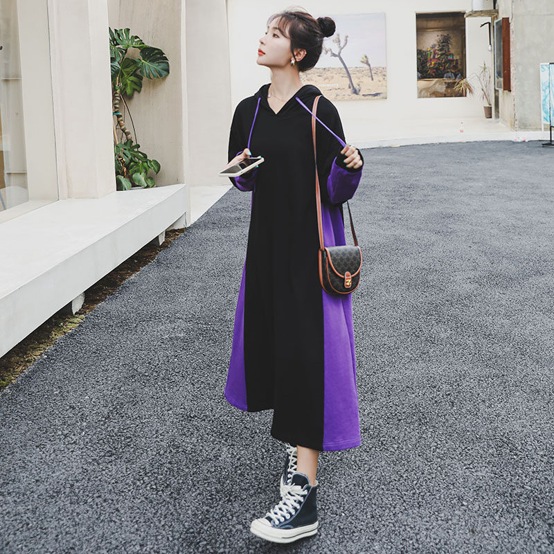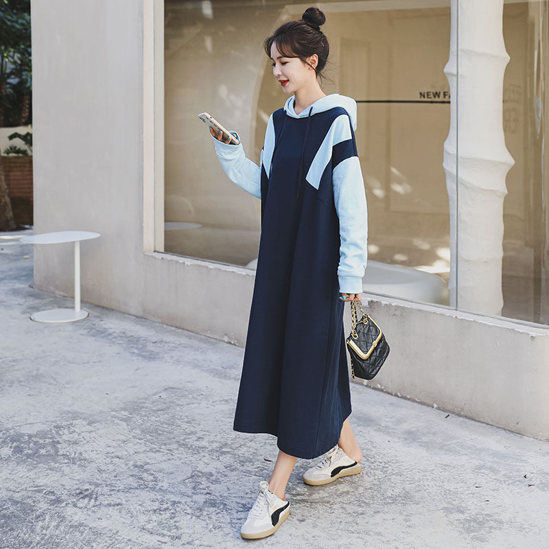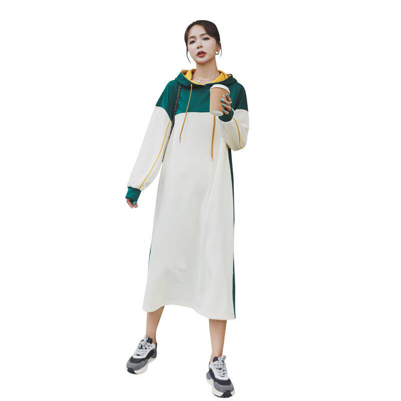 Maternity wear early spring dress tide mom mid-length version hit color loose belly cover sweater skirt Korean version hooded maternity skirt