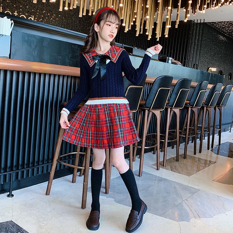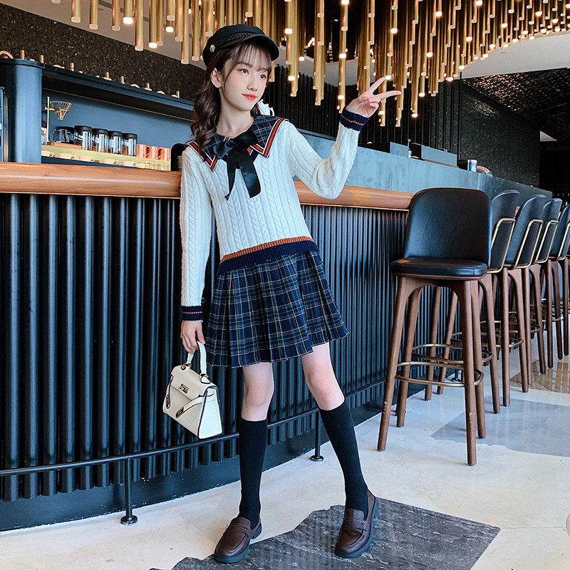 Girls navy collar personality sweater fashion early autumn clothing medium and large children's knitted sweater suit autumn