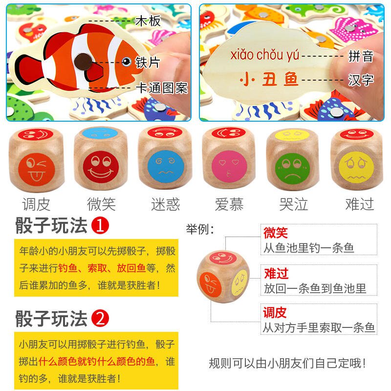 20 pieces of fish 2 fishing rods 30 pieces of jigsaw puzzle 1 grain 30 strips of fish 3 fishing rods 30 pieces puzzle 1 grain dice (30 fish 3 fishing rods 30 pieces of jigsaw puzzle 1 grain