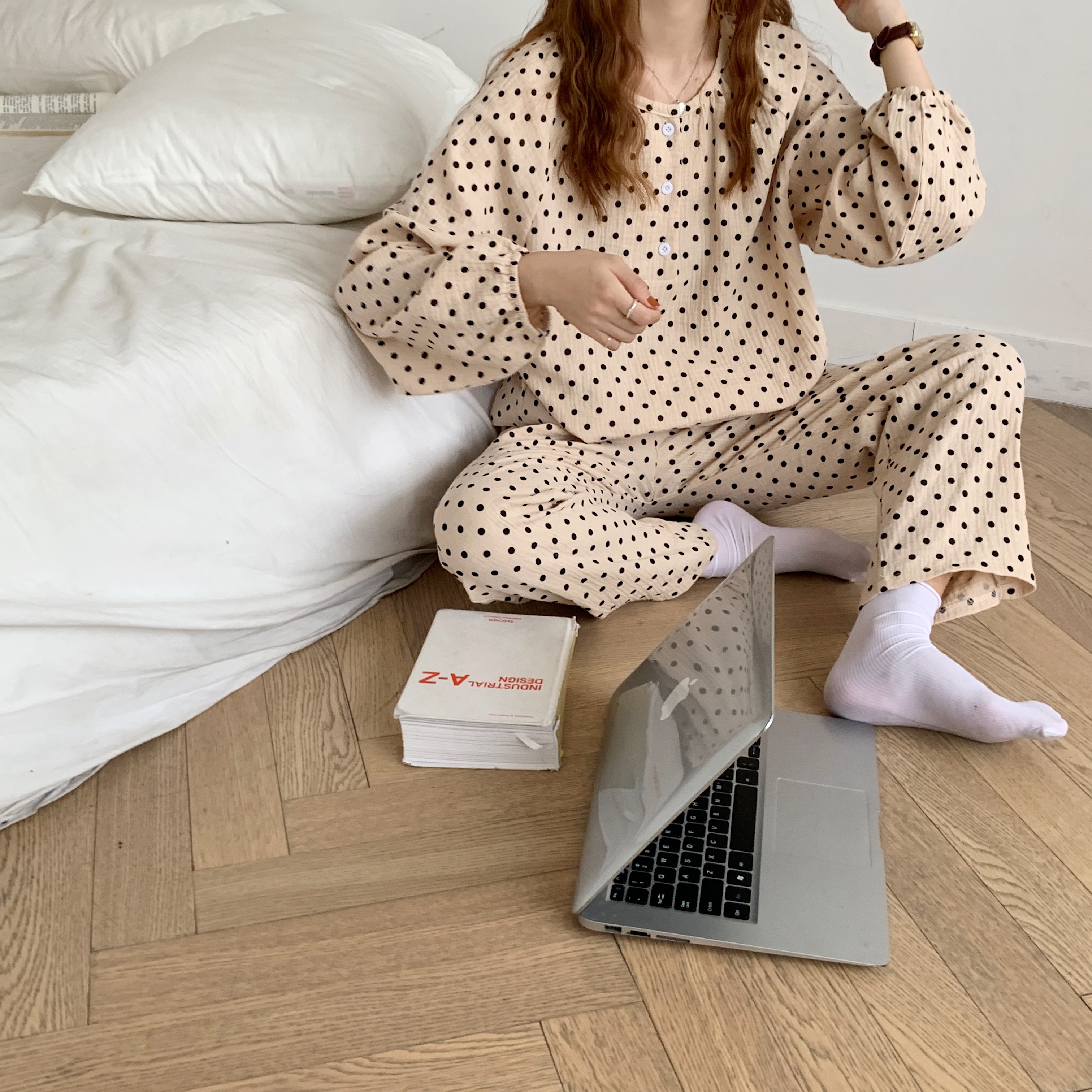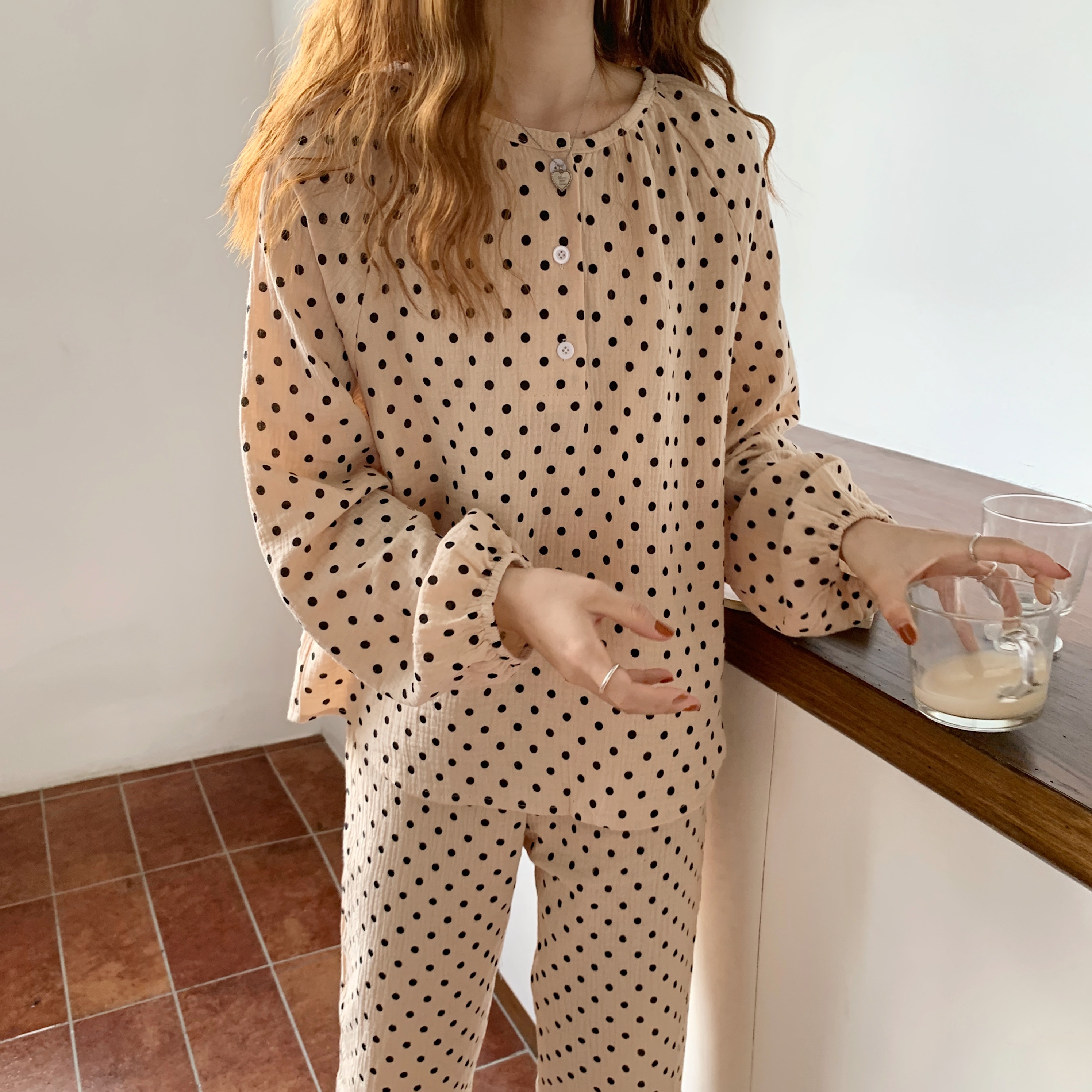 ins Han wind ~ pearl milk tea series sweet beauty wave point long sleeve pyjamas woman comfortable round collar home in two sets