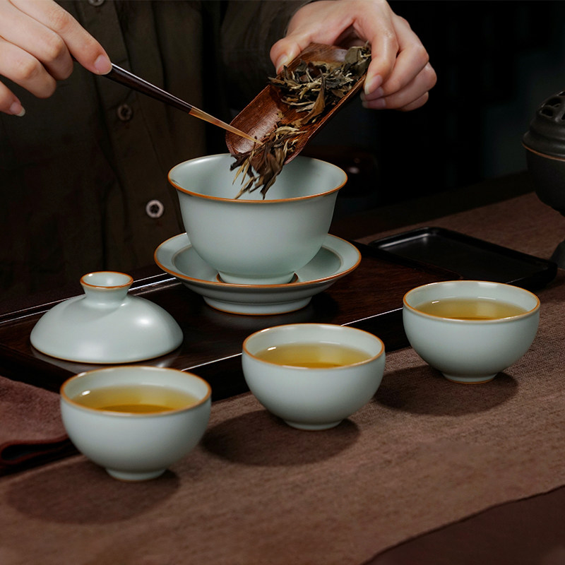 Ru Kiln Cover Bowl Suit Tea Set of Tea House Guests Complete Set Retro Wind Ceramic Jingdezhen Ru Porcelain Gift Box Installed Blue Porcelain