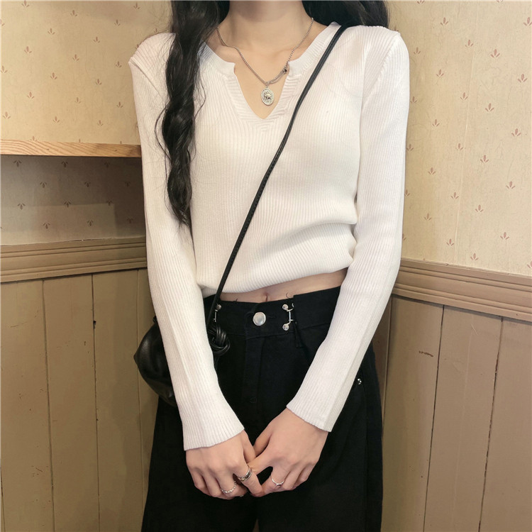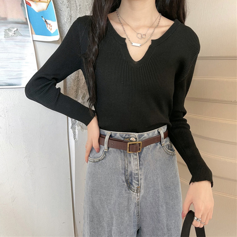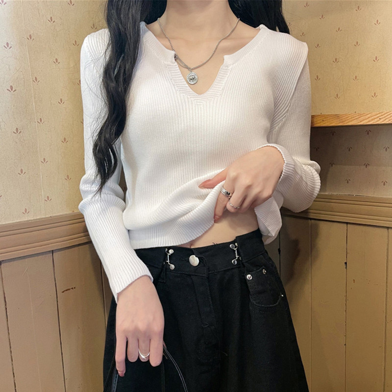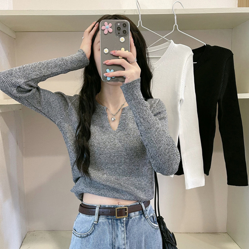 Spring and autumn new V-neck knitted sweater women's slim-fit bottoming shirt with a sense of niche exposed collarbone chic top