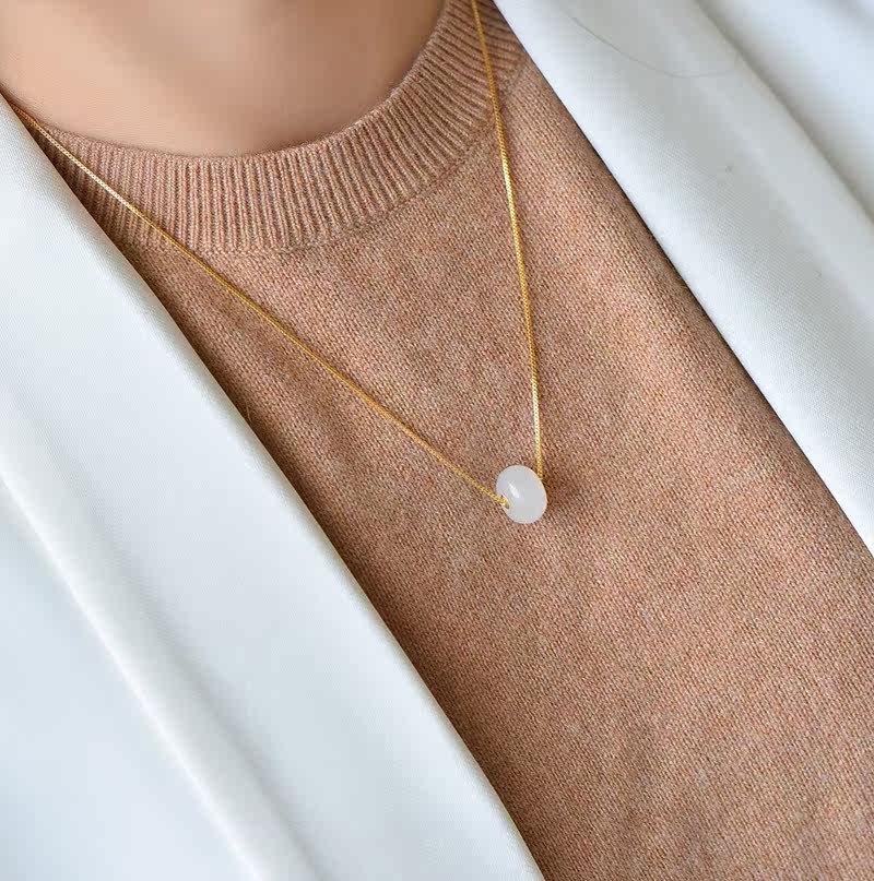 Natural Hetian Jade Pendant Women's Safe Buckle Thickened Baguette 18K Gold Inlaid Clavicle Chain Simple Pendant