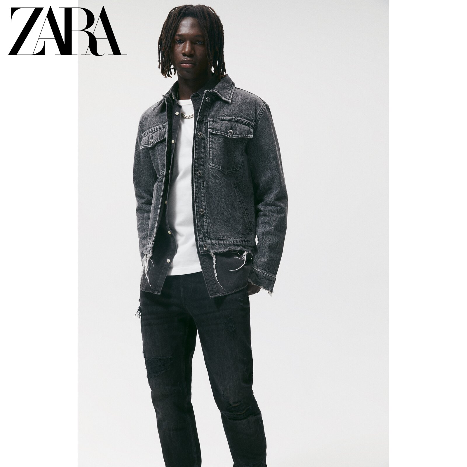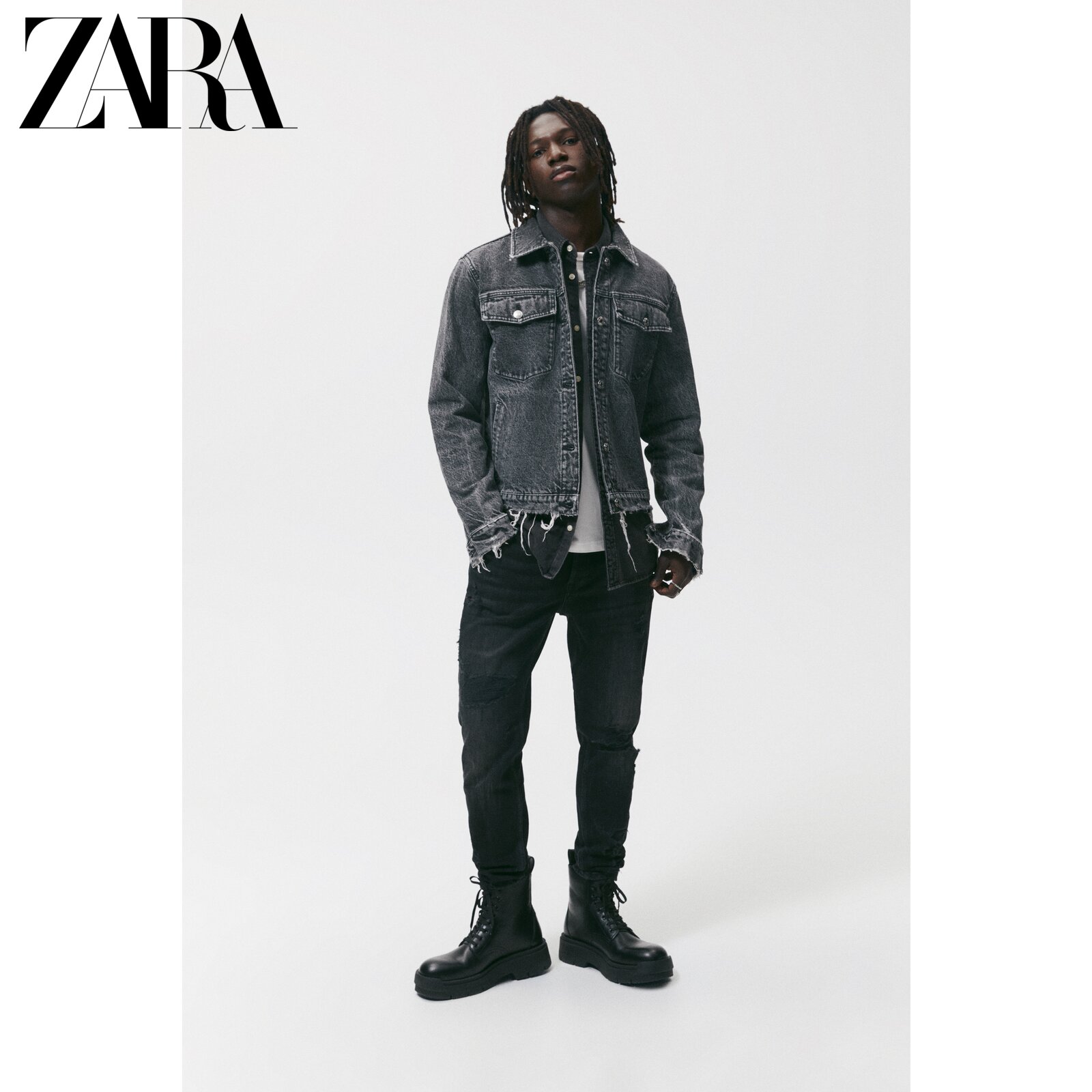 ZARA spring men's tight fit small foot breaking hole black jeans 6045340800