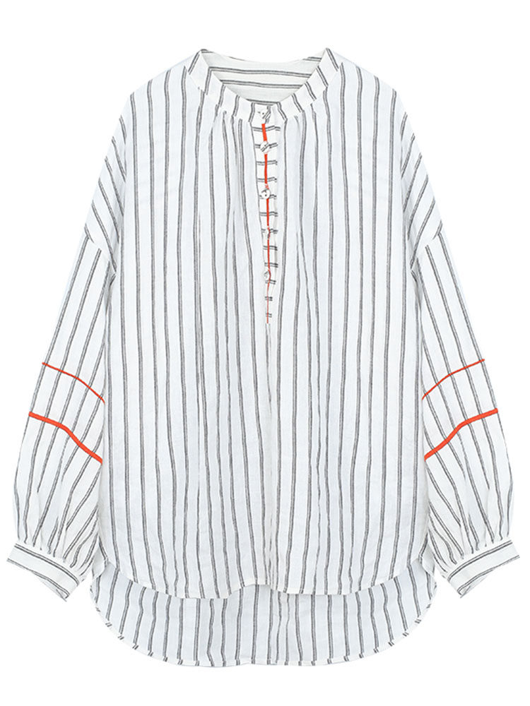 Design sense lantern sleeve loose striped shirt women's autumn French linen contrast color embroidery all-match long-sleeved top