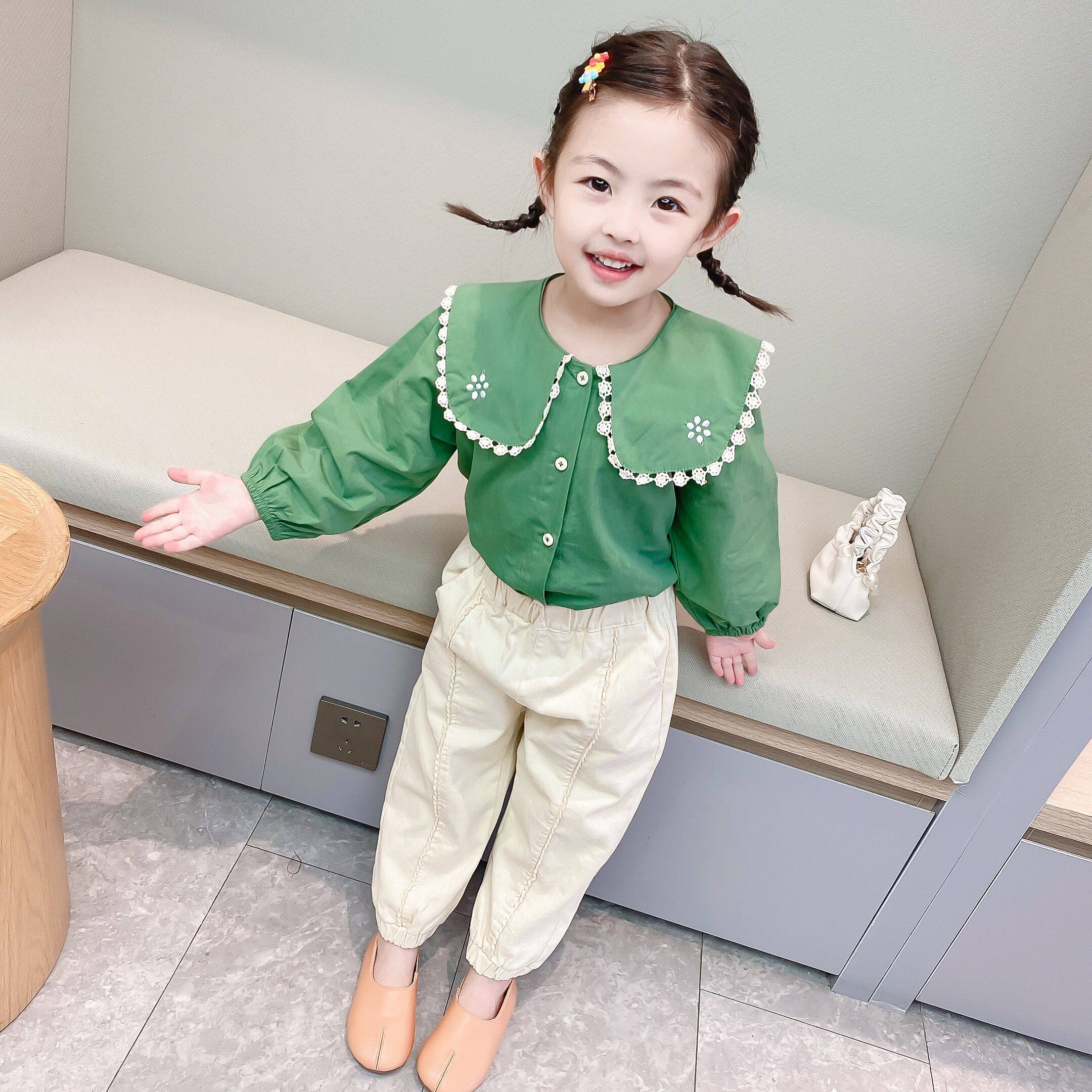 2022 new children's clothing spring clothing 3-8-year-old spring girl green curl shirt foreign palate baby spring and autumn blouses