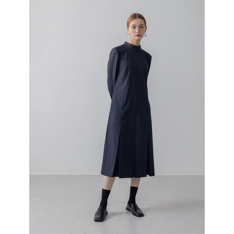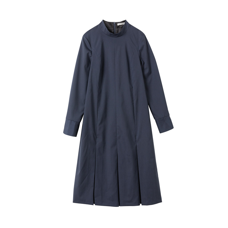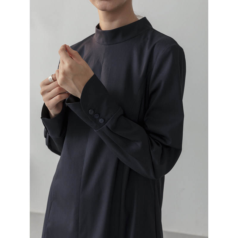 Slow tea dark blue wool blend stand-up collar slim long-sleeved dress autumn 2021 temperament commuter simple long skirt