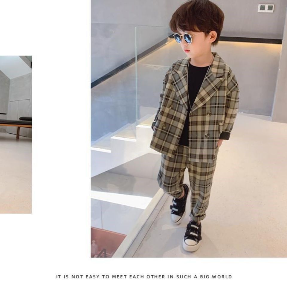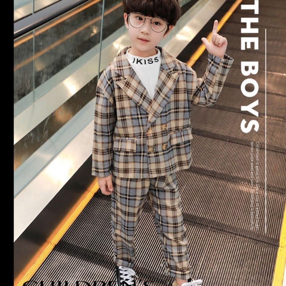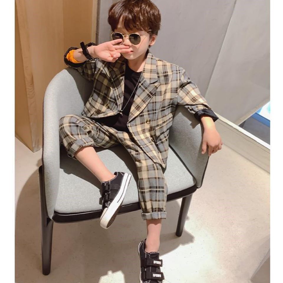 Boy 2021 Casual Little Suit Suit CUHK Boy Yinglun Wind Autumn Checkered with two sets of sleeves