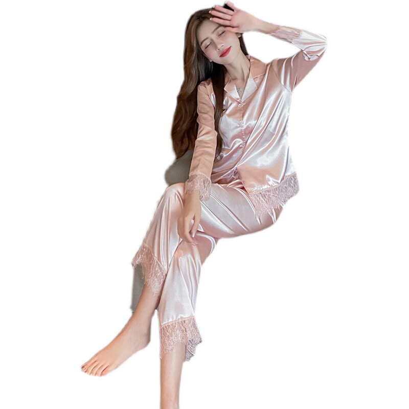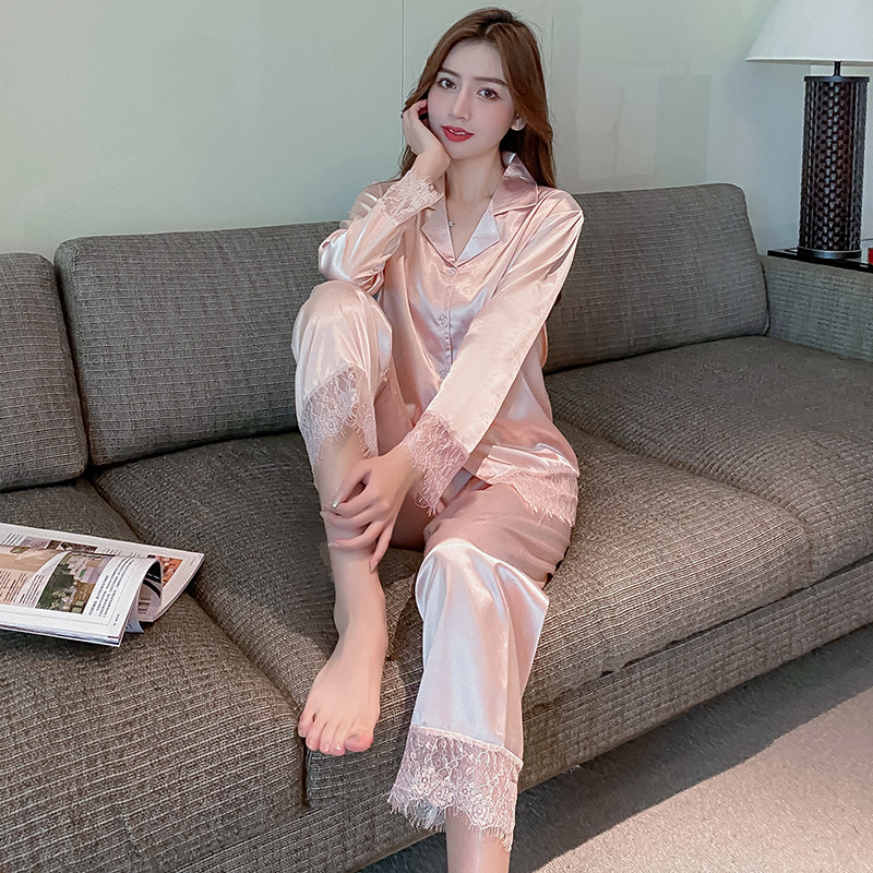 New silk long sleeve sexy lace lace pyjamas woman thin section of ice silk sweet powder suit Home Two sets