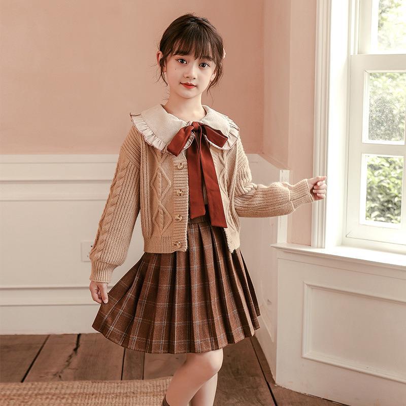 Girls jk style suit 2021 early autumn fashion Western style doll collar woolen plaid skirt retro long sleeve two-piece set
