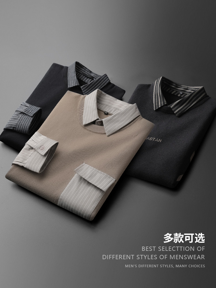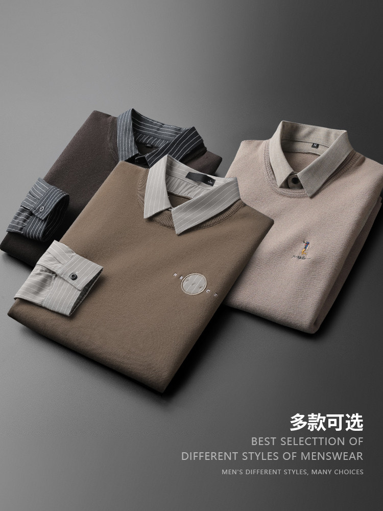 European station autumn and winter New shirt collar sweater men's fake two pieces plus velvet padded casual jersey jacket