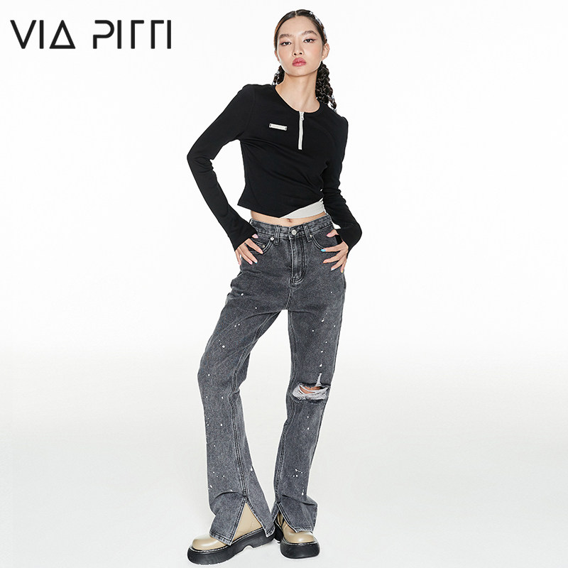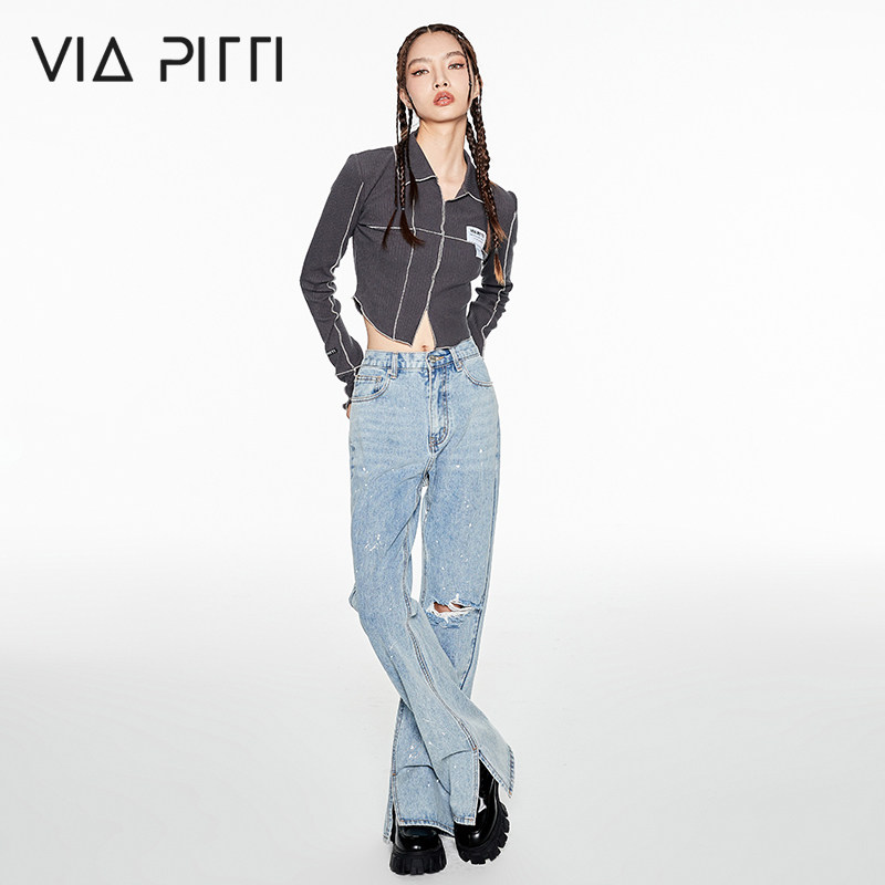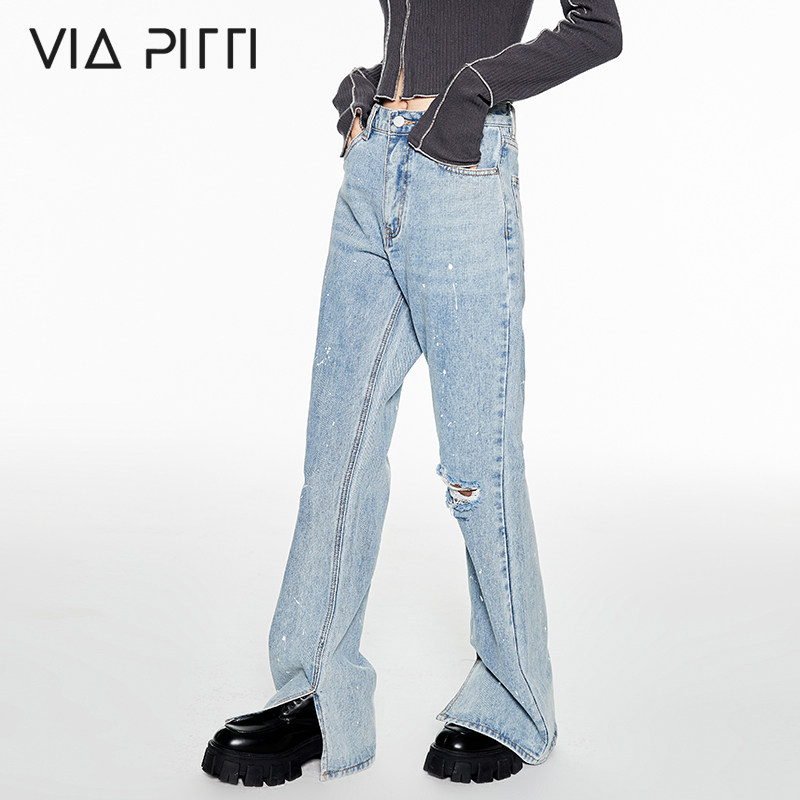 viapitti stars with the same breaking hole splashdown jeans woman spring and summer new dew knee high waist straight drum pants design sensation