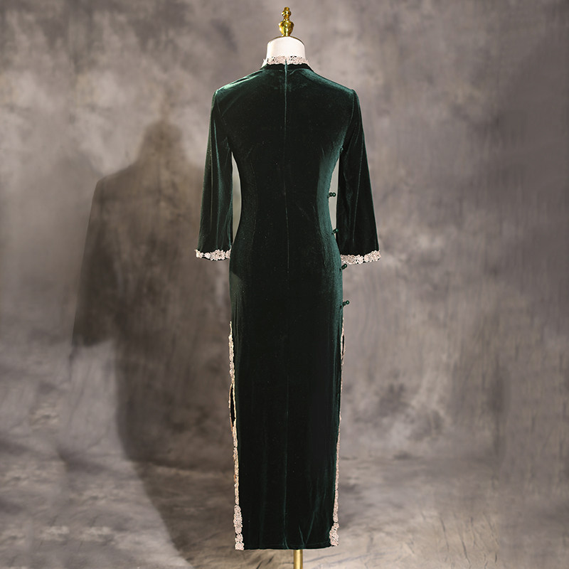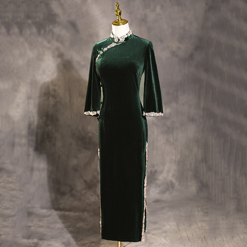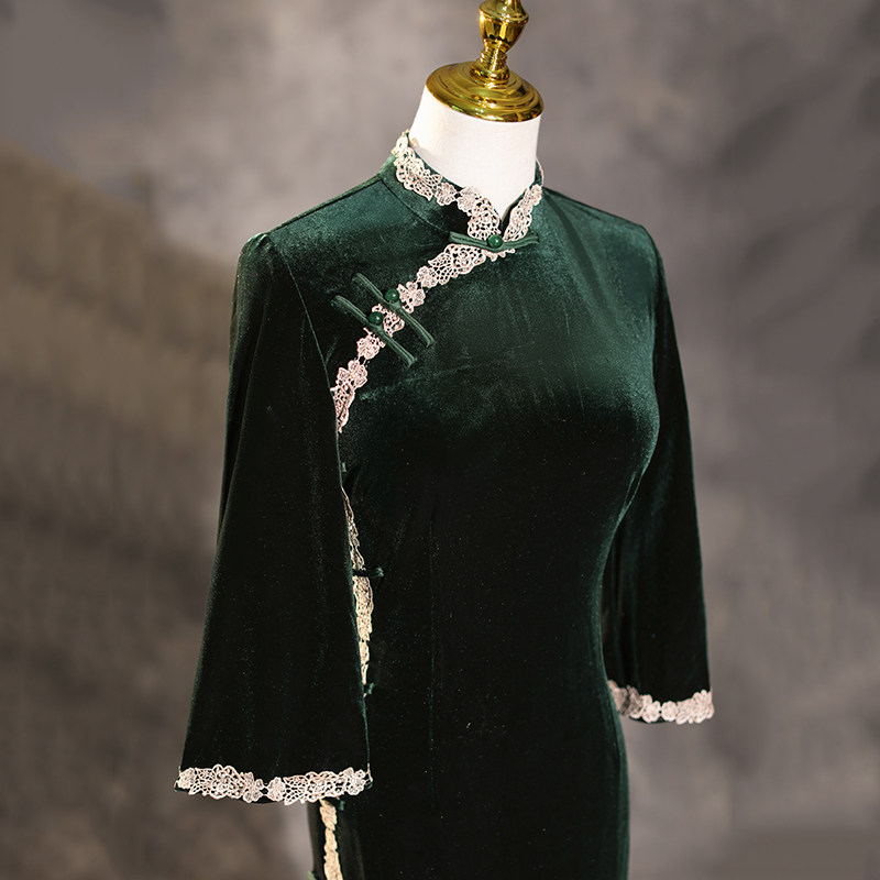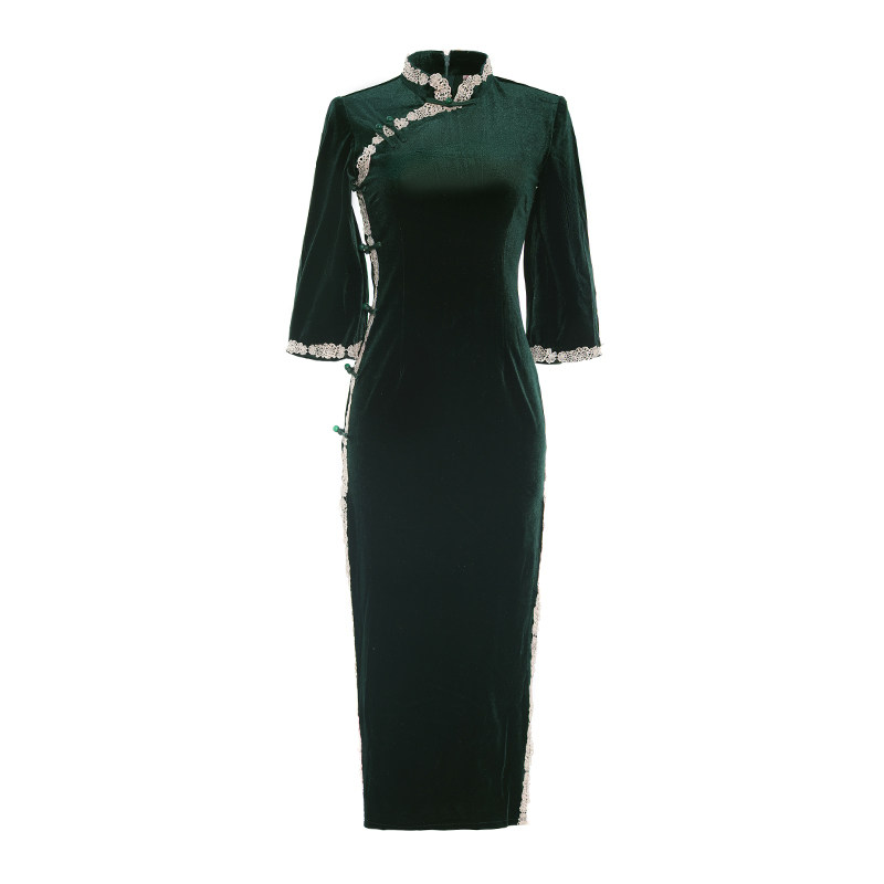 Ink Green Qipao 2022 New Improved Upside Down Sleeves Retro China Wind Velvet Dress Long Version Spring Summer Season
