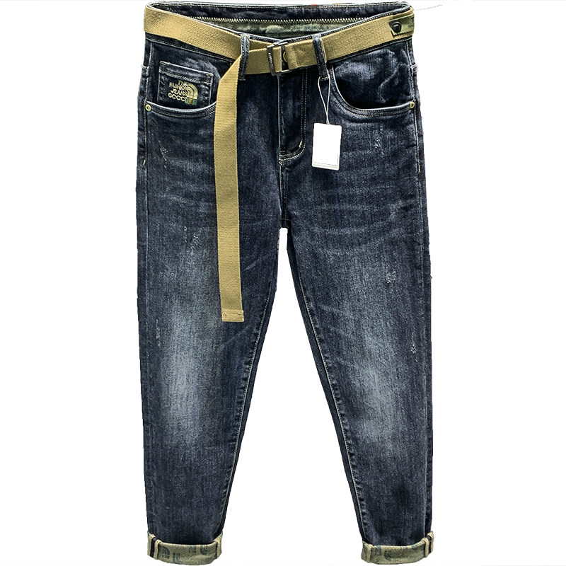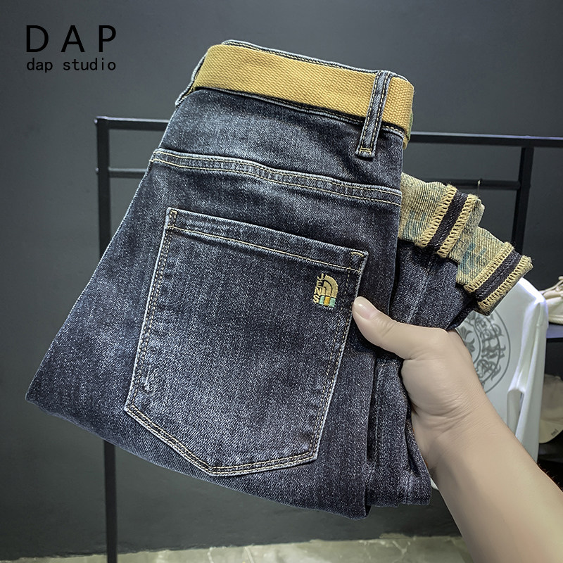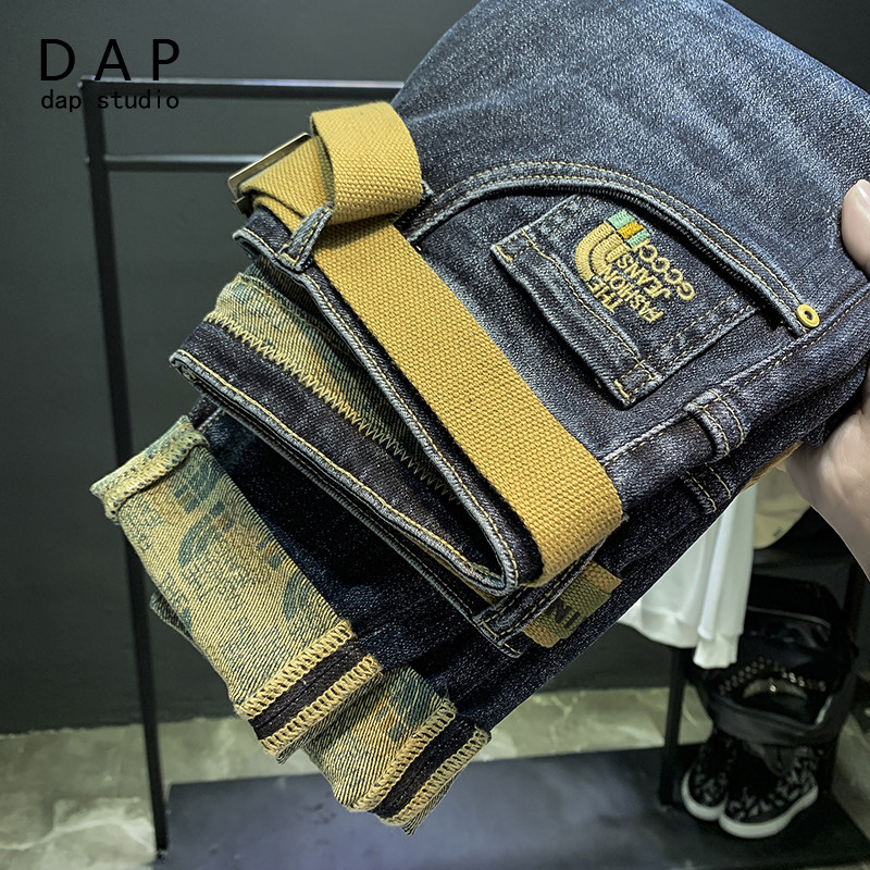 High-end tide brand jeans men's autumn and winter 2022 printing dark blue embroidery elastic slim fit men's trousers
