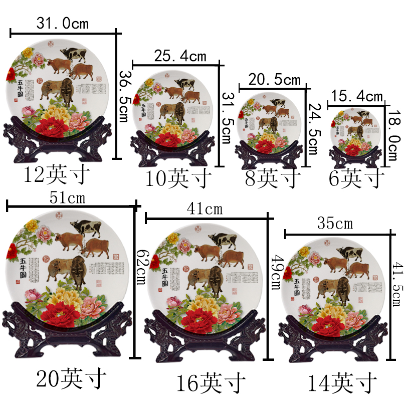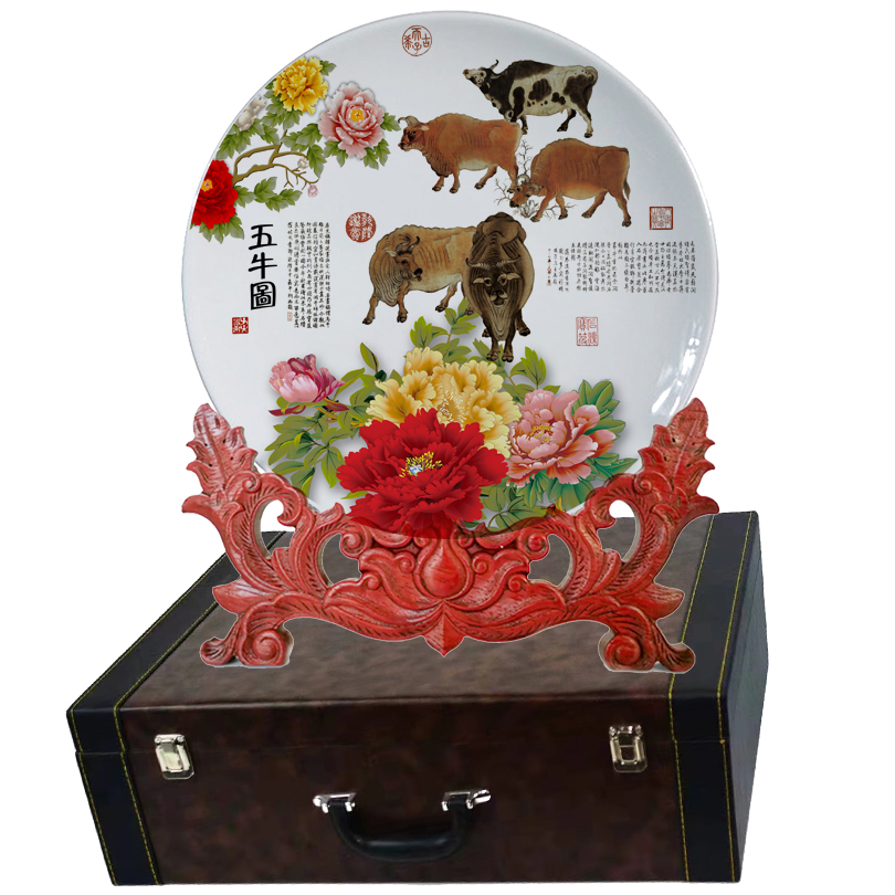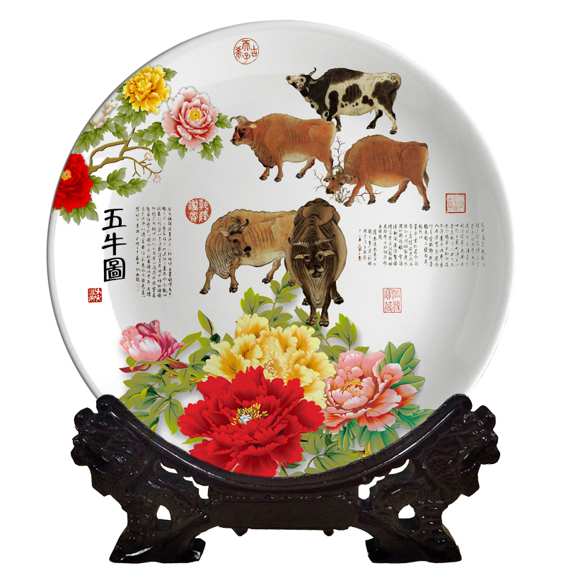 Housewarming creative gifts auspicious peony five bulls figure living room home decoration hanging ceramic plate craft decoration