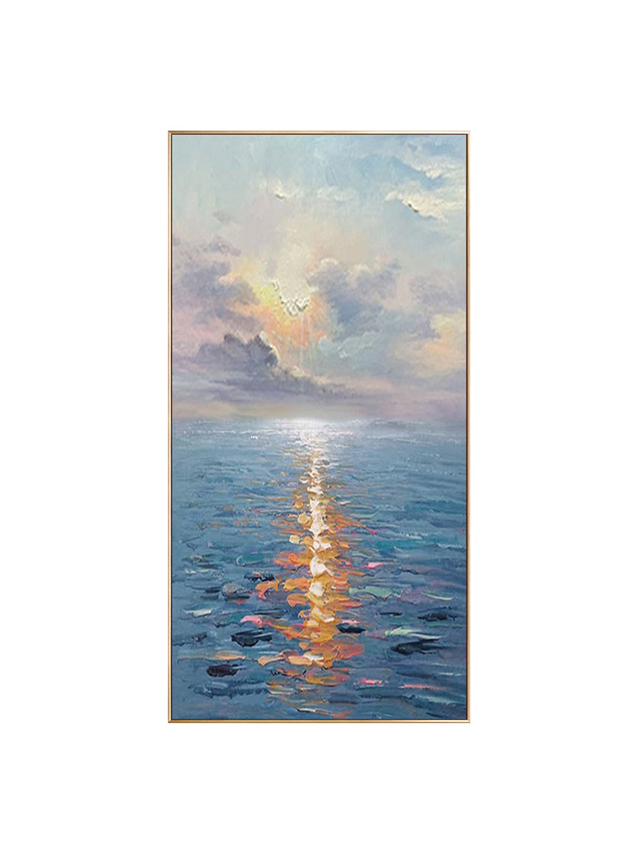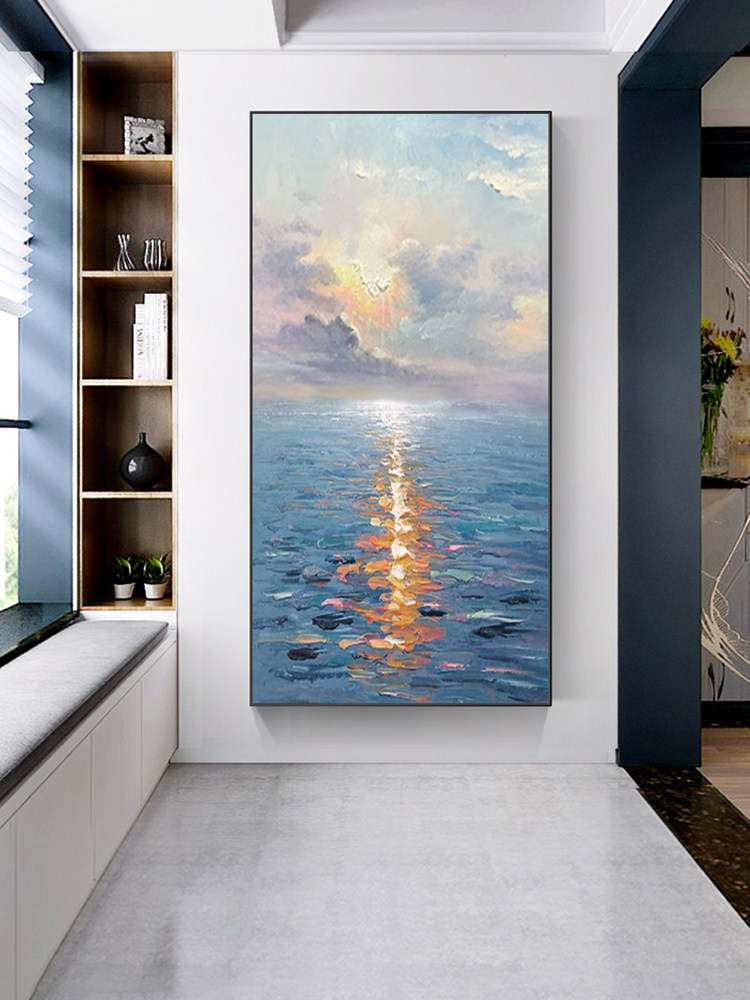 Rising sun Dongsheng Nordic entry porch decorative painting vertical version of the corridor at the end of the hanging painting blue seascape hand-painted oil painting