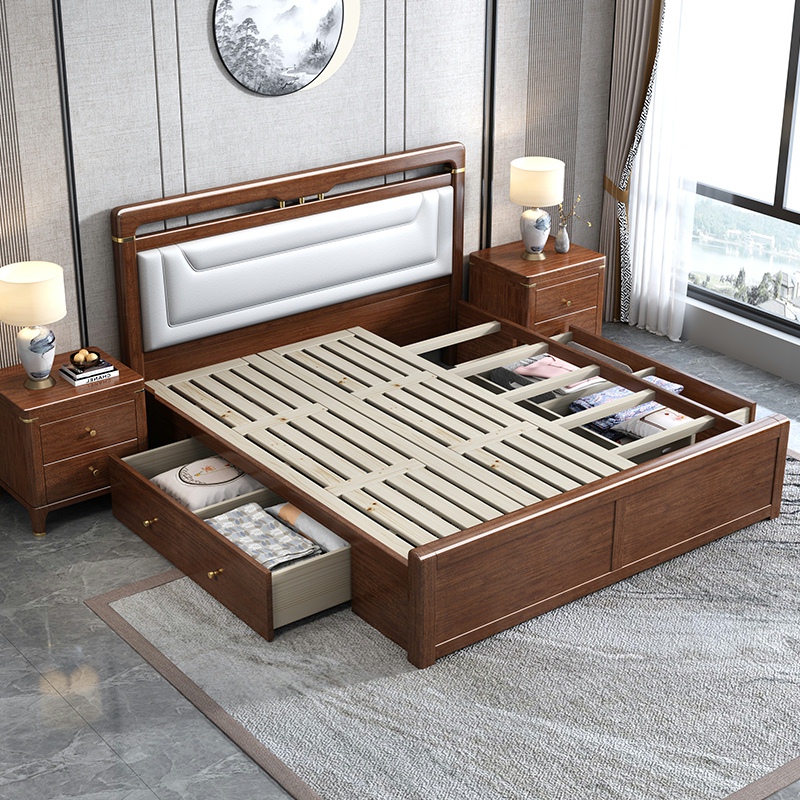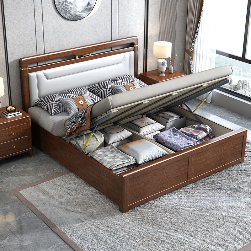 New Chinese style solid wood bed walnut double master bedroom household small apartment leather storage box bed furniture economical