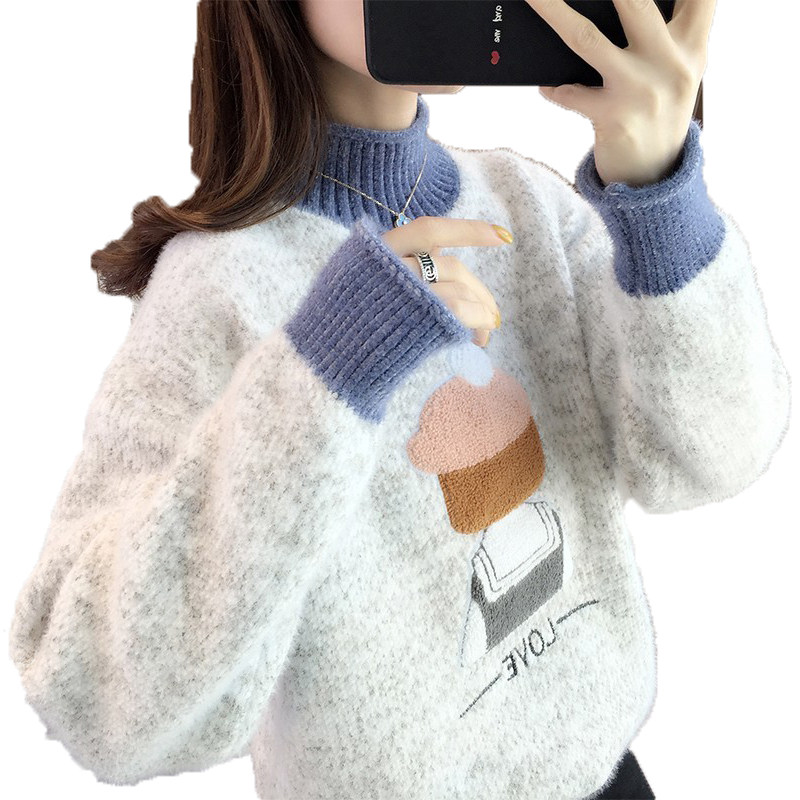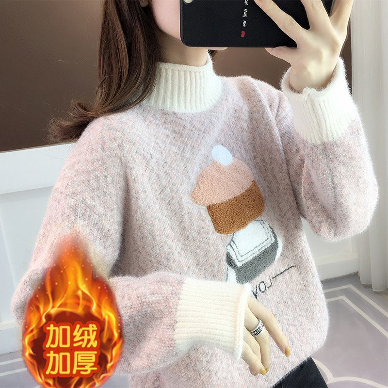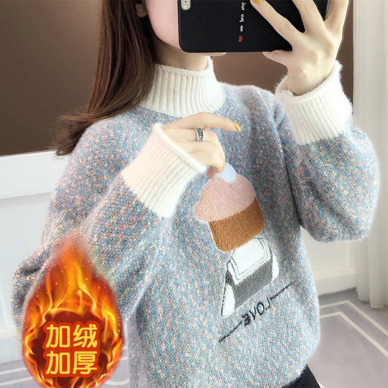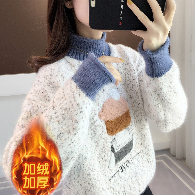 Mink velvet sweater loose semi-high collar 2021 autumn and winter New plus velvet Joker pullover student knitted base shirt