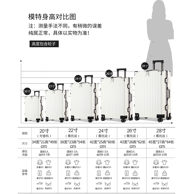 20-inch direct boarding] suitable for 1-3-day travel 22-inch short trip] suitable for 3-5 days 24-inch medium trip] suitable for 4-8-26-inch medium to long term