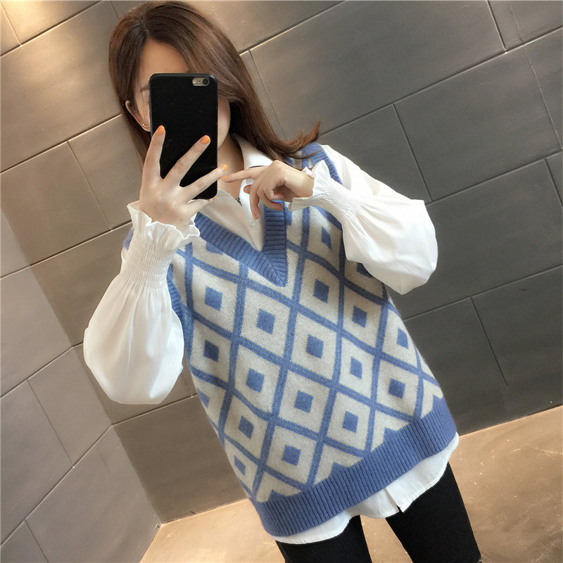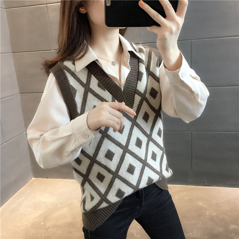 Rhombus lattice hair line knit waistcoat V collar 2021 Chunqiu retro loose sleeveless sleeveless jacket head sweater female