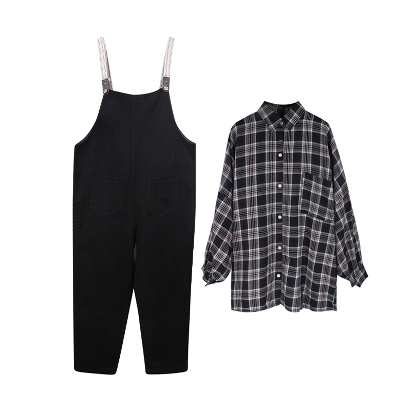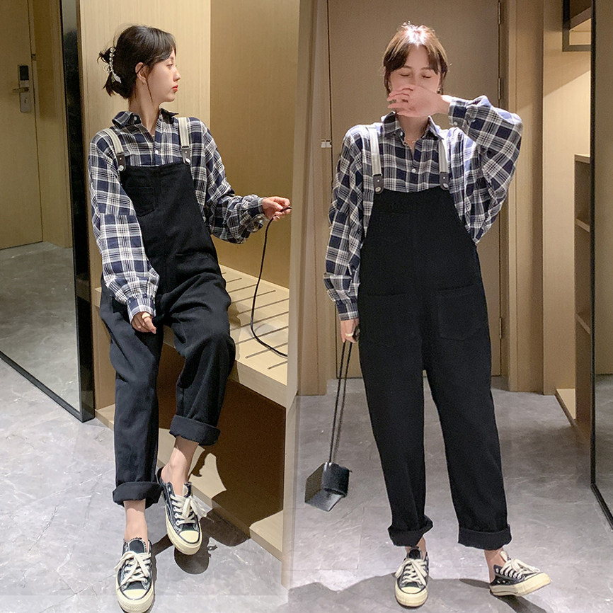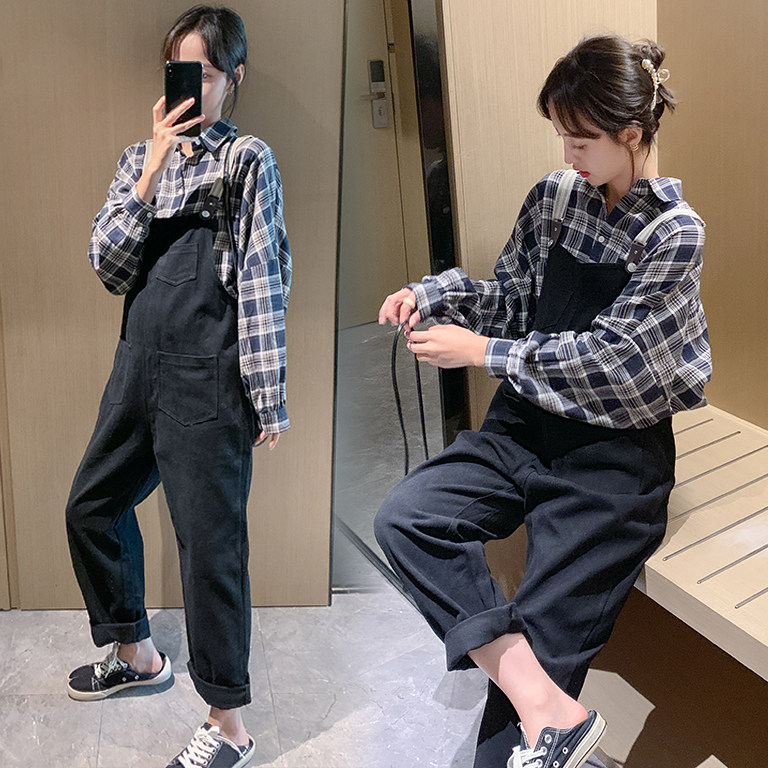 Pregnant women's autumn fashion suite net 2021 new grid long sleeve shirt loose strap pants two pieces