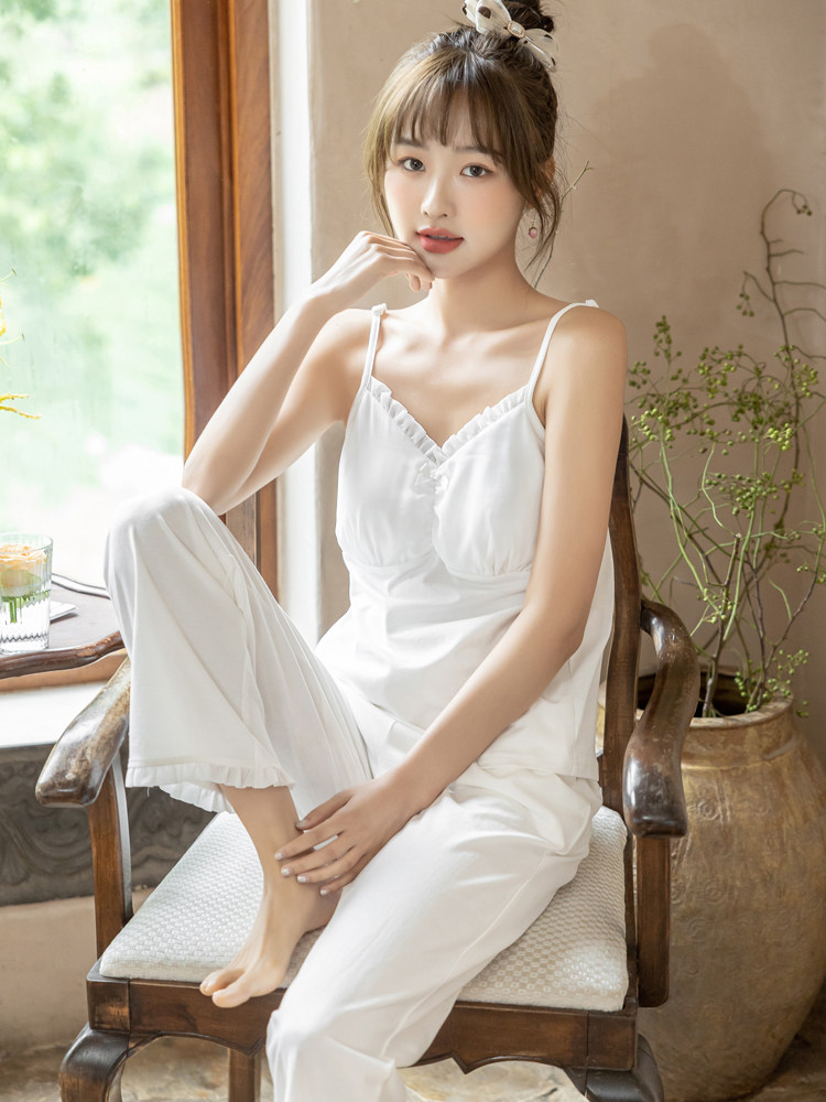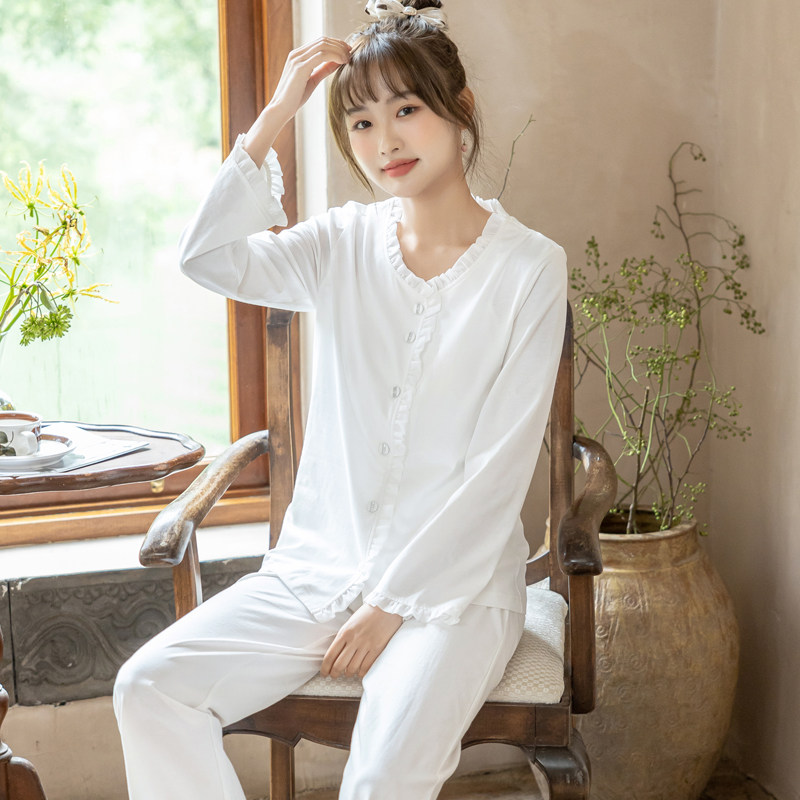 pyjamas with chest cushion female spring autumn, three sets of pure cotton long sleeve long pants white cute pure desire to wind home suit suit