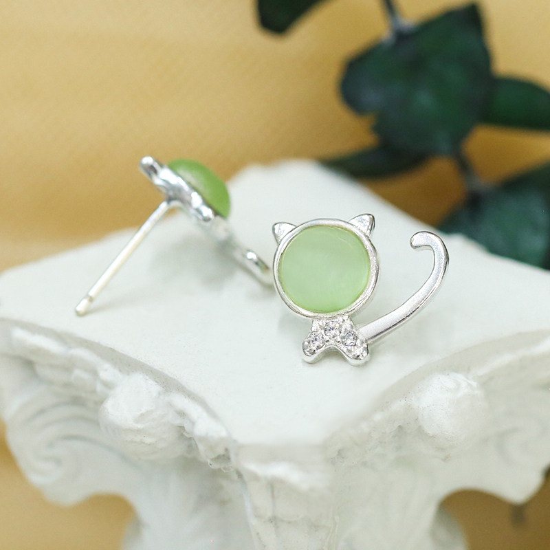 s925 pure silver green cat eye stone kitty ear pin cute little cat animal earrings earrings earbone nail silver decorated female style