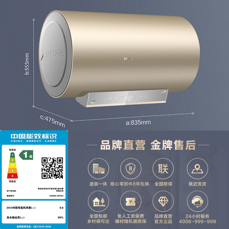 Haier electric water heater electric appliances household dressroom 3D speed heat water purification MV3 bath level 1 energy saving 60L capacity