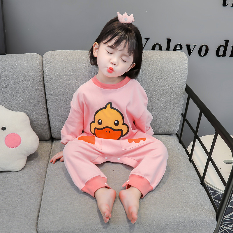 Small Yellow Duck Girl Conjoined Pyjamas Summer Spring Autumn Pure Cotton Children Girl Baby Summer And Duck Palm Home Clothing