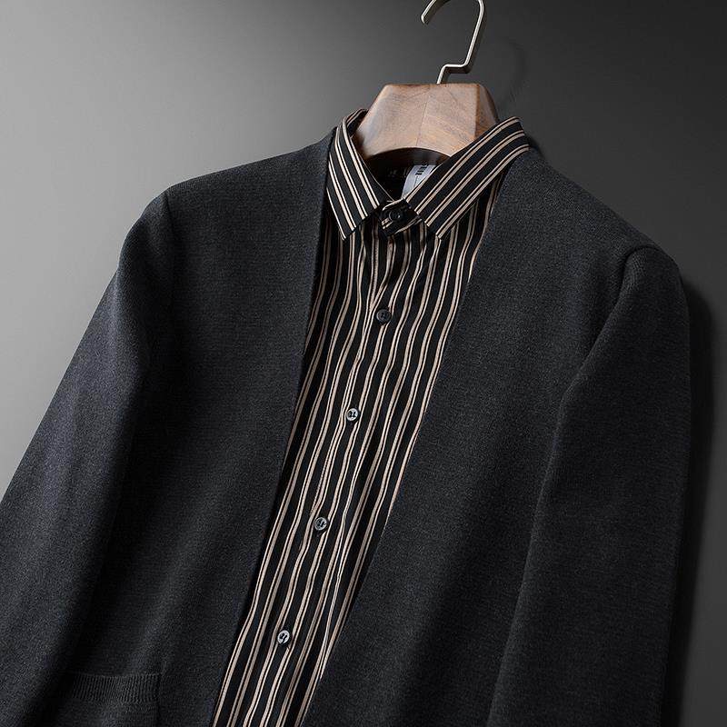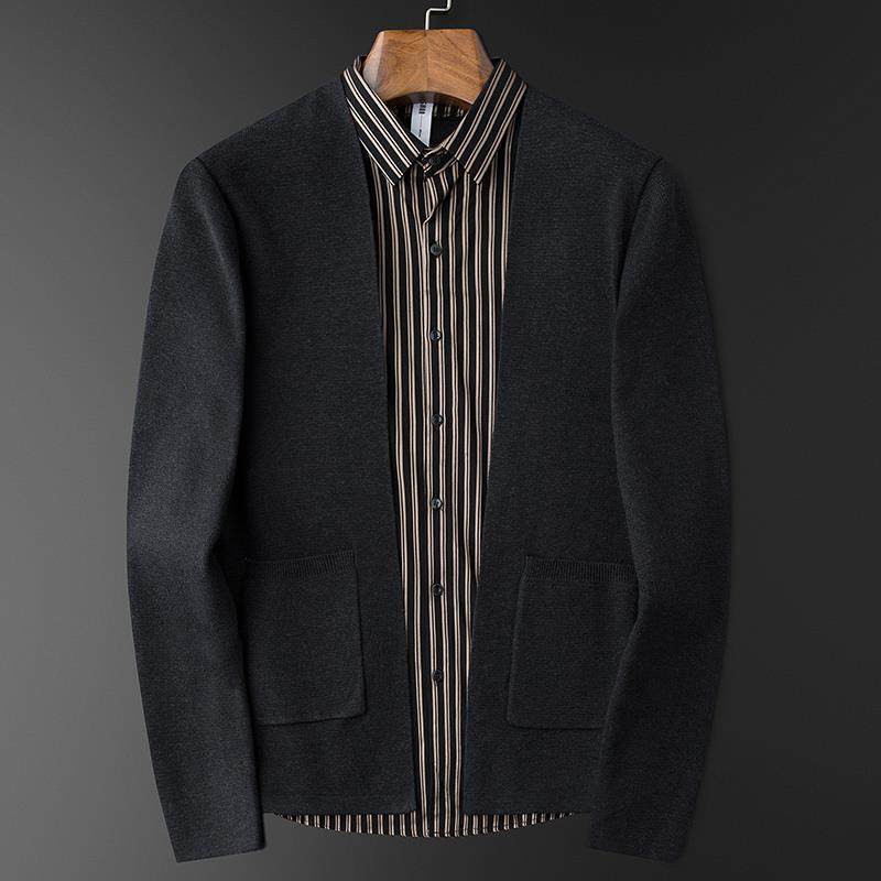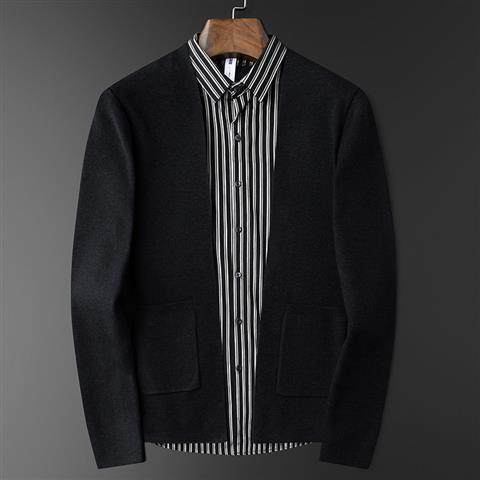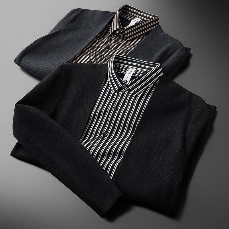 Light business Fashion casual men's fake two knit cardiouses with a handsome young striped shirt collar fur