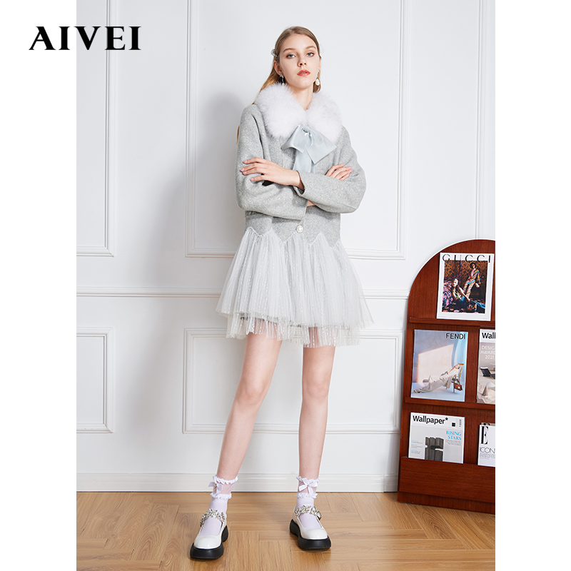 AIVEI Hingga Ai Wei 2021 Winter New Pint Bright Sheet Mesh Yarn Splicing With Fur Collar N066S022
