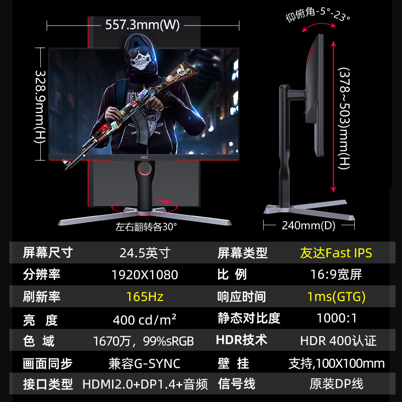 AOC 25G3 25 inch 165Hz monitor e-sports small King Kong IPS fast LCD 1Ms computer 24 5 screen 144Hz game HDR wide color gamut 27 sets