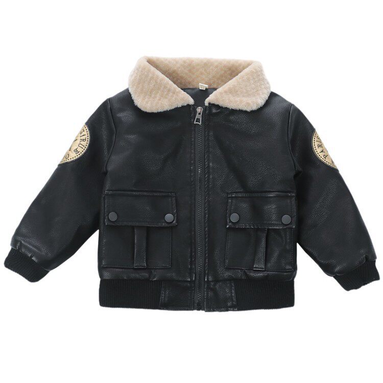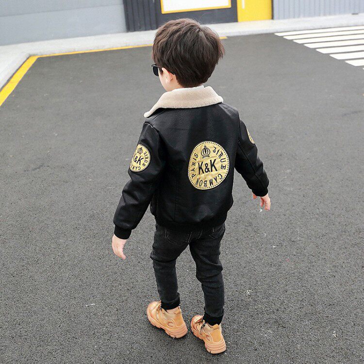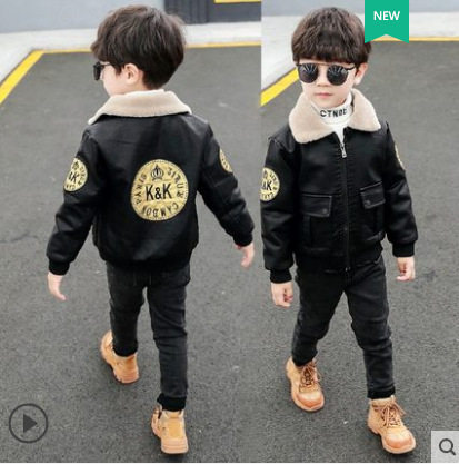 South Korea 2022 children's clothing new autumn and winter boys plus velvet leather baby Korean version of the hip-hop style stand collar net red jacket thick