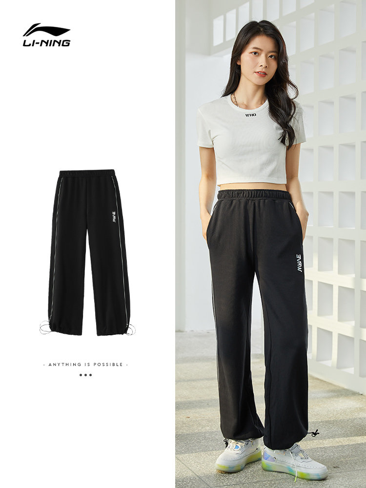 Li Ning Sports Pants High Waist Straight Drum Lady Long Pants Loose Casual Pants Spring Summer Thin black draw rope Leather Pants