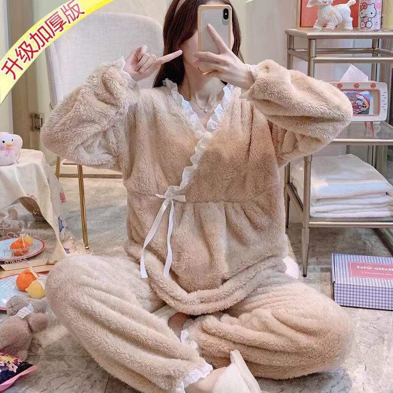 Spring, autumn and winter pure cotton postpartum lactation breastfeeding thickened coral velvet confinement clothing pregnant women pajamas flannel November