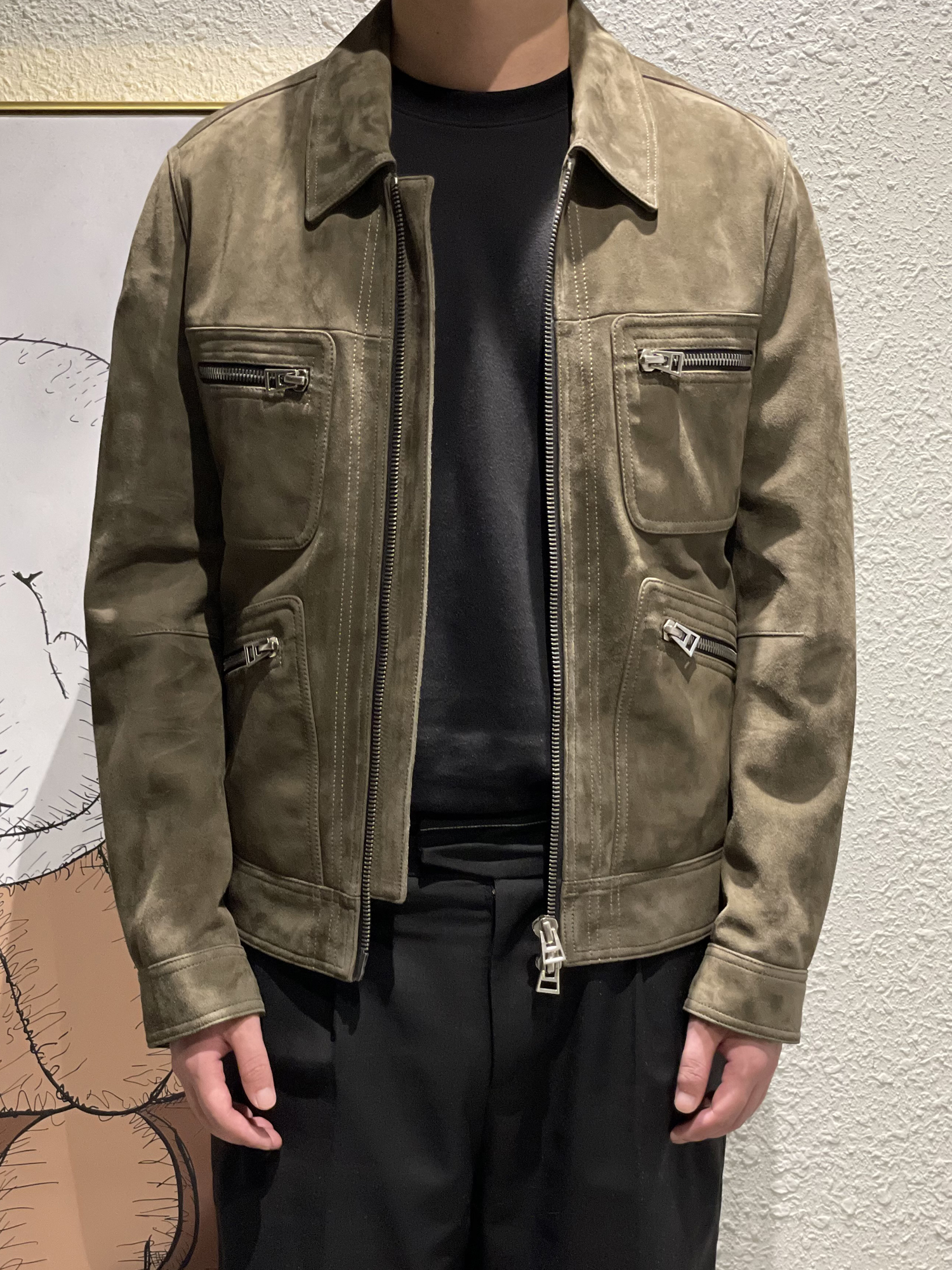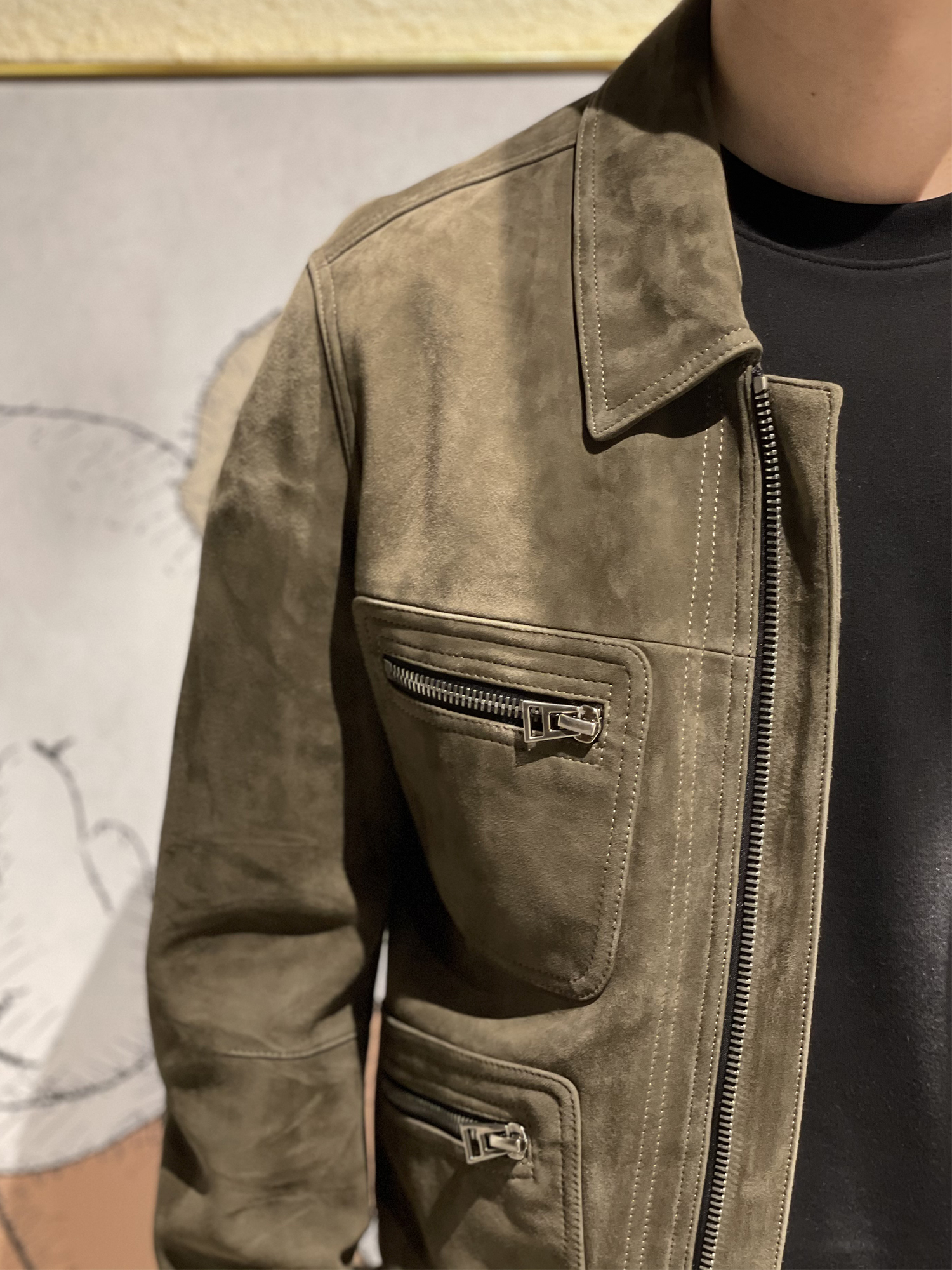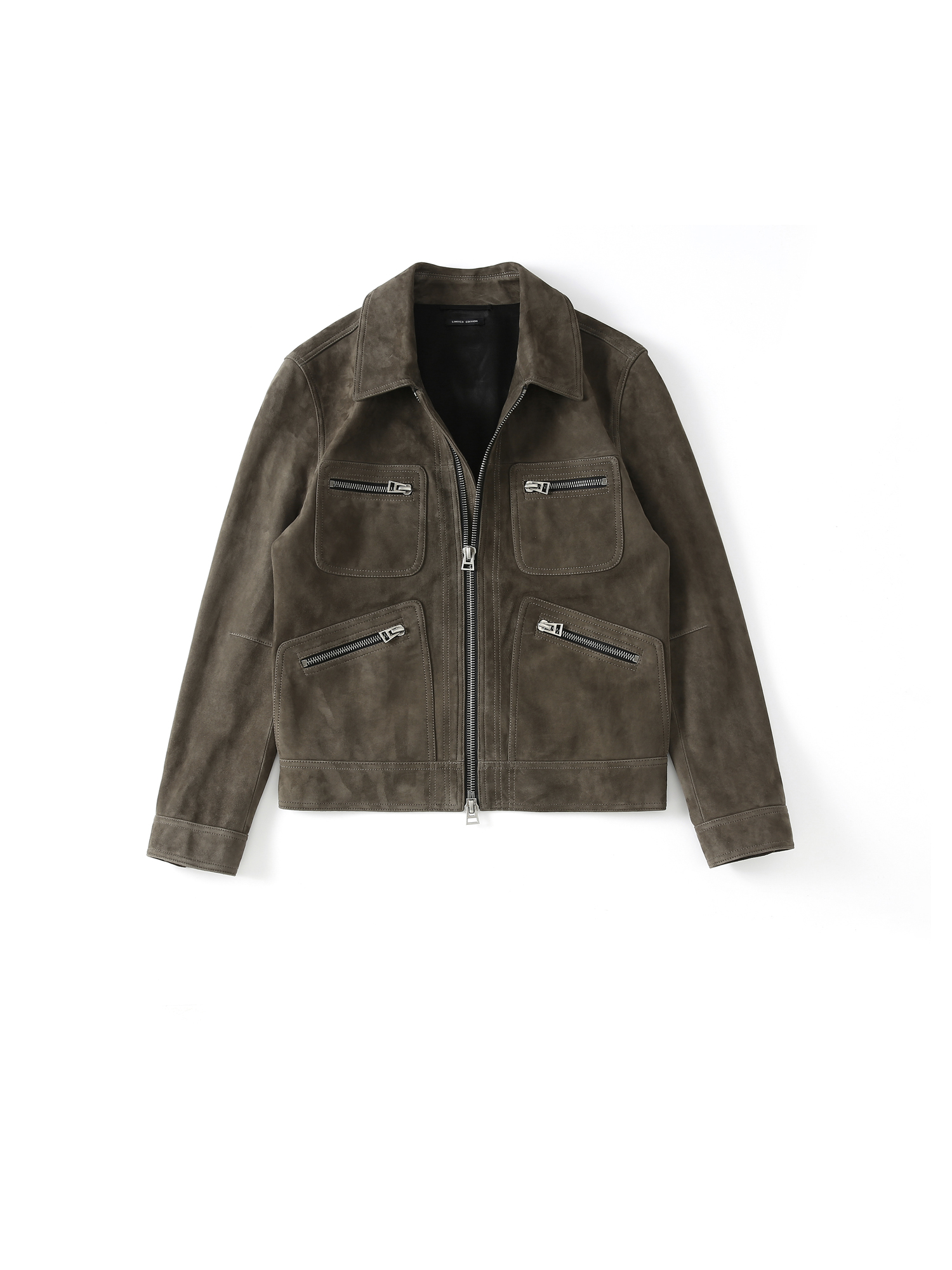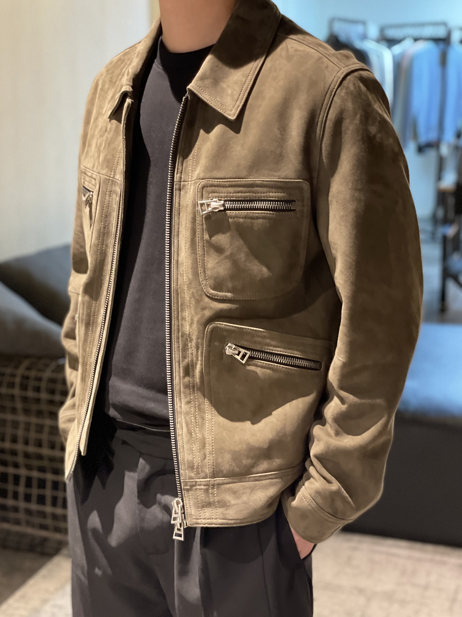 La Califfa "overbearing president texture pull full" spotted dove coffee lambskin slim denim jacket leather jacket