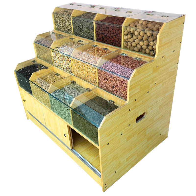 Supermarket furnishing candy dried fruit bulk is called snack food rice rice grain and oil grain grain display cabinet